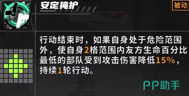 他具有一个安定掩护的技能。当行动流程结束后,如果玩家自身处于安全区域内,此时会触发一个效果:系统会以玩家为中心,在2格范围内寻找生命值百分比最低的友方部队,并为其施加一个持续1轮行动时间的减伤状态,使其受到的攻击伤害降低15%。