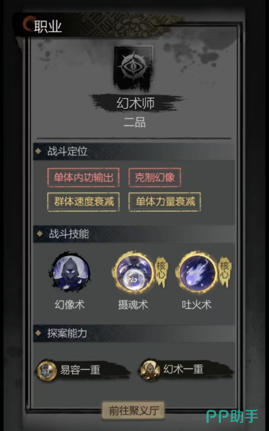 吐火术能够对敌方单体造成和内力、气血相关的内功伤害,如果目标是幻象,有额外的伤害加成,这一点都可以快速将对方的幻象清理掉,在战斗中也是非常有用的一项技能。幻术师后续还可以继续转职成为四品幻术师,技能方面并没有明显变化,但是属性强了很多。