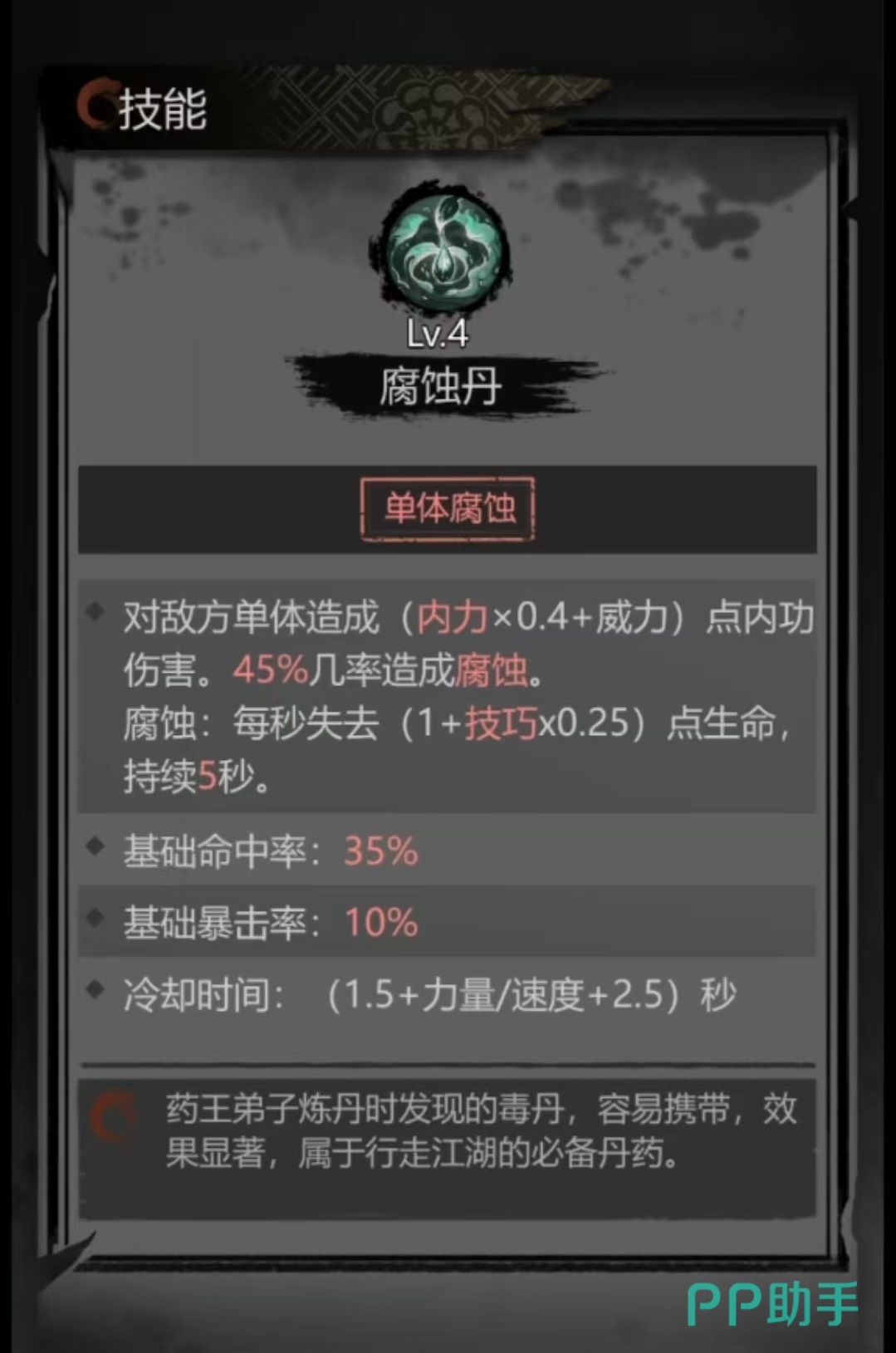 丹师的主要战斗技能有三个,分别是腐蚀丹、寒霜丹和回春丹。腐蚀丹的效果是对敌方单体造成内功伤害,45%的几率造成腐蚀,威力和内力相关,对方被腐蚀之后,每秒钟会失去少量生命值,持续5秒钟。寒霜丹的效果是对敌方单体造成内功伤害,60%几率造成速度衰减。对方被影响后,将会降低速度,降低的速度值和技巧相关,对方的速度被降低之后,在战斗中就难以发挥出应有的节奏,也是很多战斗中都需要丹师出场的原因所在。