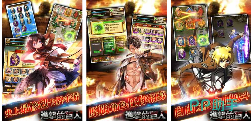 本作是款由同名动画片开发的卡牌互动游戏,进击的巨人动漫里的角色的都能与你邂逅,日系风格的美术和经典剧情塑造也是亮点,史诗级的特效以及立绘演绎都是点睛之笔,进击的巨人全角色都一比一呈现具备不俗代入感,精致酷炫的卡牌战斗体系别具一格,轻松好玩的卡牌PK快感令人沉浸。