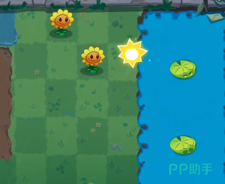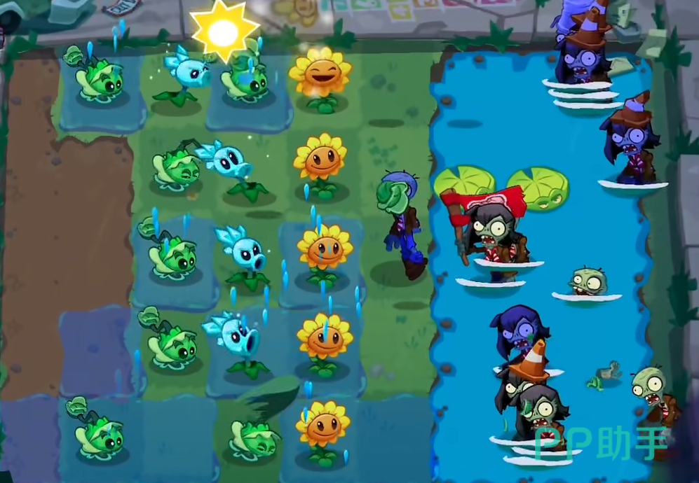 这个是属于中后期的关卡了。此关是有着较小的池塘,这点需要玩家们小心一点才行。一开始玩家们需要先种植两个向日葵来收集阳光,这一关我们的阳光在前期是非常少的。所以需要多收集一些阳光才行。关卡初期有赠送我们两个莲叶,但是一开始的僵尸都不会从那两处莲叶过来。前面我们至少拥有3个以上的阳光才行,然后在池子中间的位置放置一个莲叶来进行阻挡。在莲叶的后面建议放上一个冰冻豌豆。这样可以有效的对付这条路上的敌人。接下来第一条路的水池需要放置一个莲叶。
