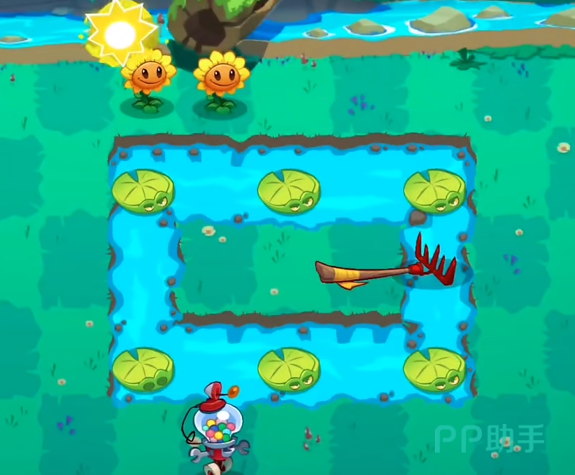 本关中间有一个环形的水池。上下一开始会各给3个莲叶。一开始首先在上方放置向日葵。本关我们的阳光数量也不多。刚开始需要以种植向日葵为主。在满足阳光要求后在最下方种植一个坚果,然后在中间的最后面放一个竹子迫击炮。接下来在莲叶的最前方放置坚果。这样可以为我们争取到不少时间。之后每一行的最后面放置竹子迫击炮,前方放置坚果,中间可以放迫击炮或者豌豆射手,基本上可以平稳渡过这一关。
