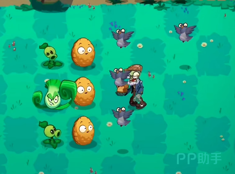 一开始首先老样子去种植向日葵来进行阳光的收集。玩家们最好将向日葵都种在最后一排。接下来等阳光收集到一定的程度便需要在第一排的中间或者是靠前的地方种下一个菜问。因为很快便会有敌人会从第一行过来。记得在菜问的前面放置一个坚果,因为在僵尸之后很快便会有鸽子前来,没有坚果阻拦的话是很难对付的。接下来在所有没有坚果的路上前面放置坚果。之后陆陆续续会有不少鸽子出现。我们只要守住了这两波的话,后面只需要不断的增加植物便可以顺利通过关卡了。