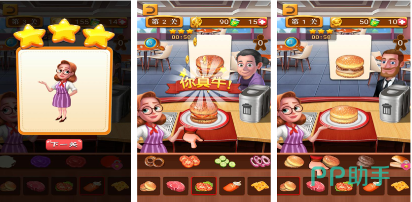 汉堡烹饪店这款竖屏操作的经营类游戏呈现出多元化内容,食材收集、烹饪和门店经营等内容齐备,超前的经营互动机制带来的快感更胜一筹,汉堡店经营的特殊理念致使代入感更胜一筹,多元化食材带来的汉堡口味也十分多样,萌系卡通的美术让经营过程显得生动有趣,汉堡店真实的经营环境也很有代入感。