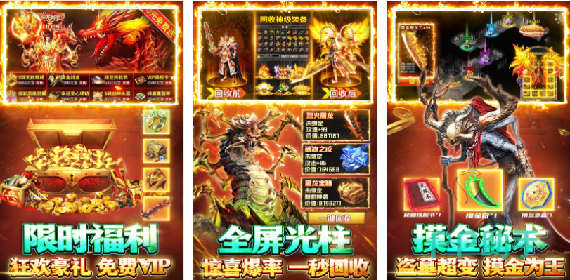 本作是加入了打金、冒险和RPG元素的全新王者游戏,三职业转职和沙城争霸等玩法应有尽有,神器系统和众多神器宝宝也悉数登场,酣畅的打击感以及优秀的特效呈现别具一格,各种限时福利活动全新上线等待小白玩家获取,光柱爆装备的特色画面也令大家血脉喷张,装备全靠打的良性机制也是本作标配哟。