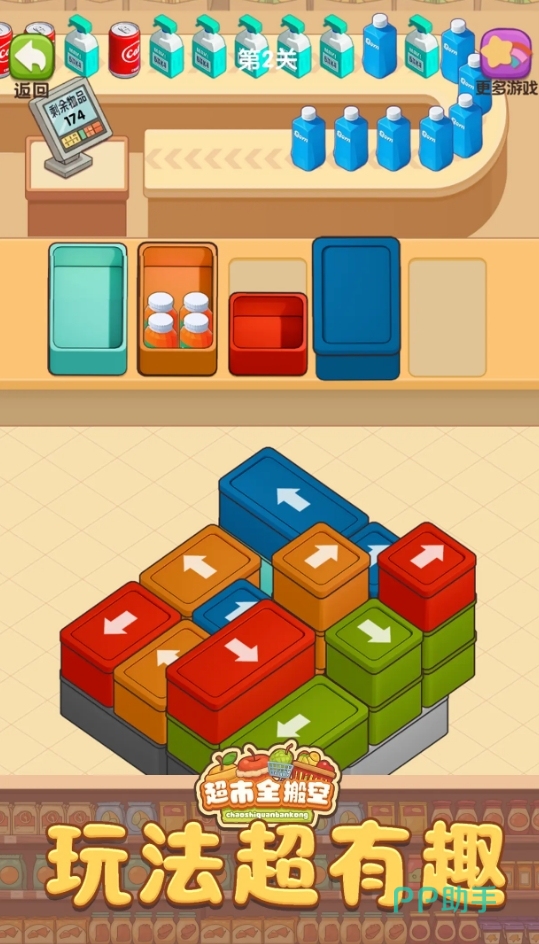 超市全搬空是很有趣味的装货类游戏,玩法很简单,小孩子能也轻松弄懂。游戏会通过流水线源源不断地向玩家运送来各种不同的商品,而玩家所需要做的,就是将这些商品根据颜色分好类,然后装入与它们本身颜色一致的打包箱中,待所有的货物都完成装运后就能取胜。它玩起来有着很不错的解压乐趣,也很能训练玩家们的反应。