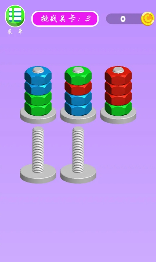 游戏有着很考验思维能力的玩法,可拿来给孩子作为趣味解谜游戏来体验。它的目标是让人们通过移动螺母,将不同的螺母分开,并把它们按颜色统一归类到螺栓上。游戏里的关卡数量非常的多,而且每道关卡在难度上都有很独特的设计,并不会让玩家觉得雷同,使得游戏不光很好玩,还十分的耐玩,达人们也可在休息时用来解闷。
