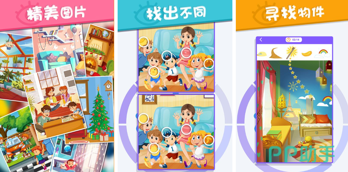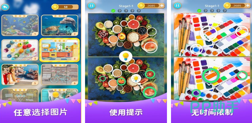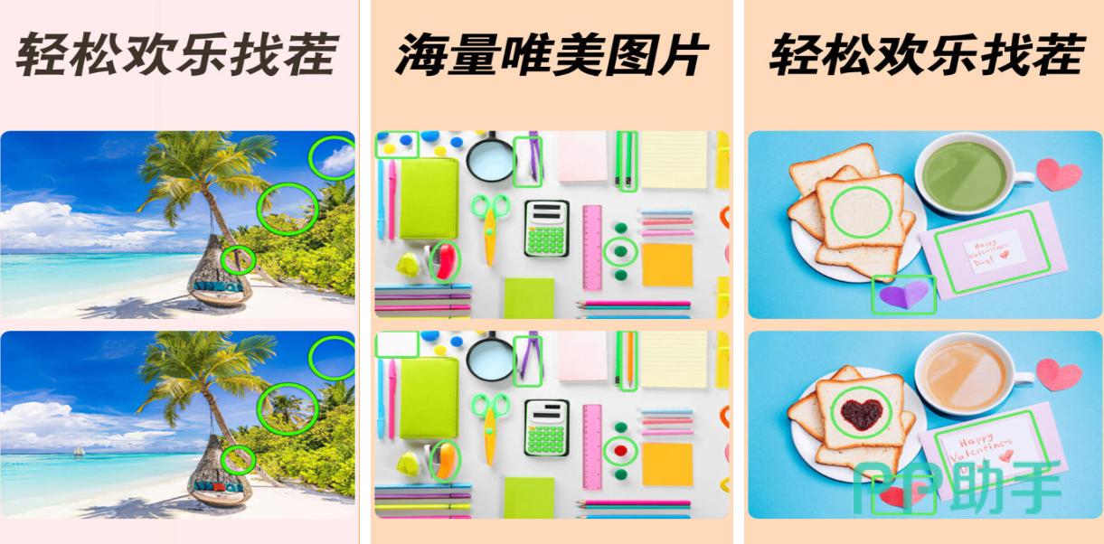 这款找不同主题的游戏呈现出了各种各样的图片,专业的提示按键能帮助玩家快速寻找到不同地点,最大亮点是本作没有时间的设定,足以让玩家沉浸在两幅图片中自由进行找茬,实在找不到也可自由使用提示十分良心,游戏提供的图片美术风格卓越,明亮鲜艳的色彩展现也是本作的点睛之笔。