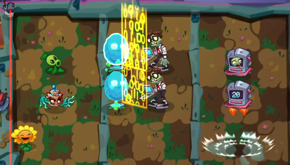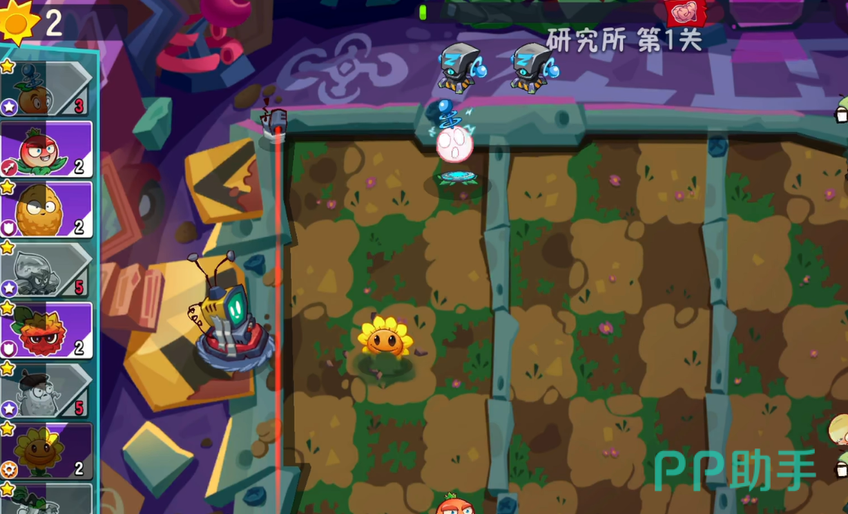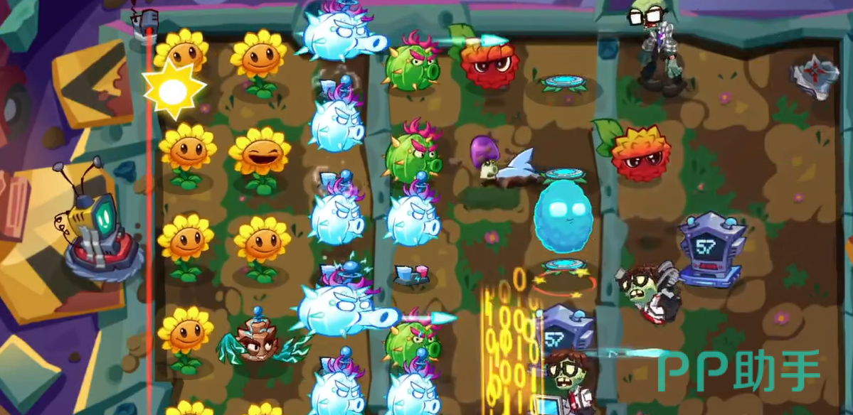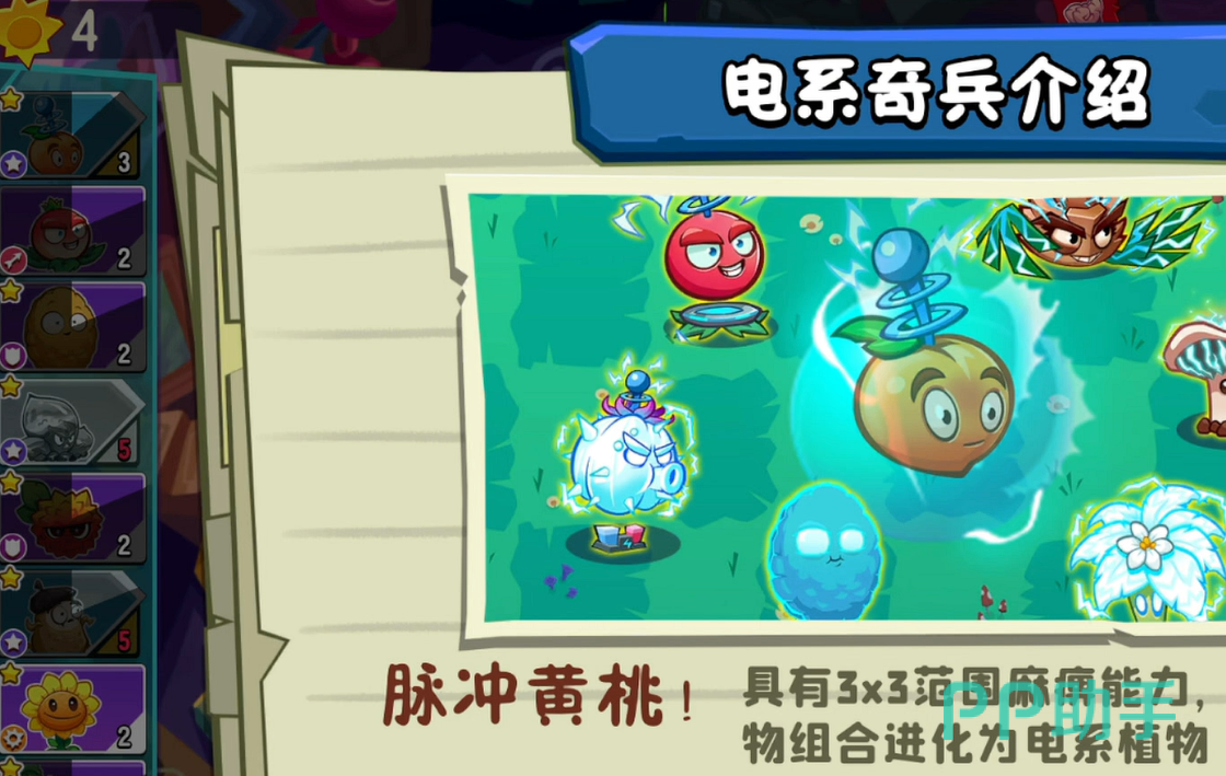 在攻打之前,大家可以先准备好一些有用的植物。第一个推荐大家用脉冲黄桃,用了它就可以让一些植物进化成为电系,这样就可以具备麻痹能力。因为在这个关卡的地图顶端会出现三个电磁发射装置,会对非电系植物造成麻痹以及额外伤害,所以大家就一定要带电系植物。