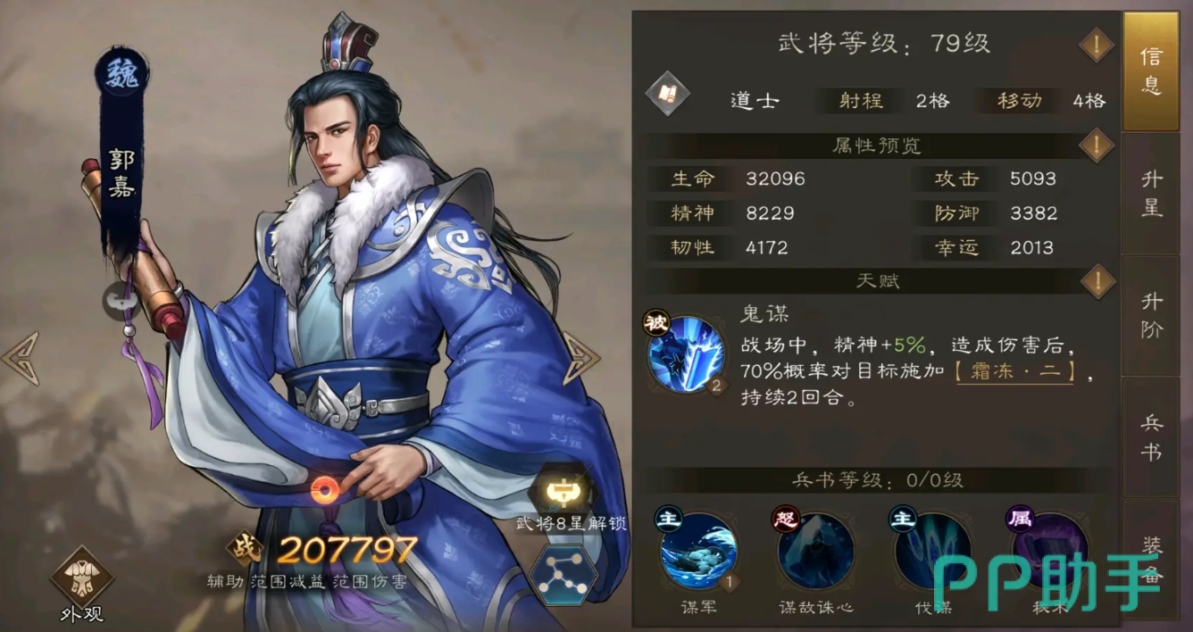 程昱,在策士职业中,曹操阵营拥有程昱和荀彧两位可供培养的将领,而选择程昱的原因与乐进在步兵中的突围原因相似,皆是因为其统率能力更为出色,尽管荀彧的智力略高于程昱,但统率方面却仅有57,与程昱的82相比差距显著。在为程昱挑选宝物装备时,五火神焰扇、皮衣或漆黑道袍与藏甲天书或朱雀宝玉的组合值得考虑,五火神焰扇虽然仍然保留了增加 20%计略损伤的效果,但需要注意的是,其增加损伤的效果并非火灾系统策略所专属。