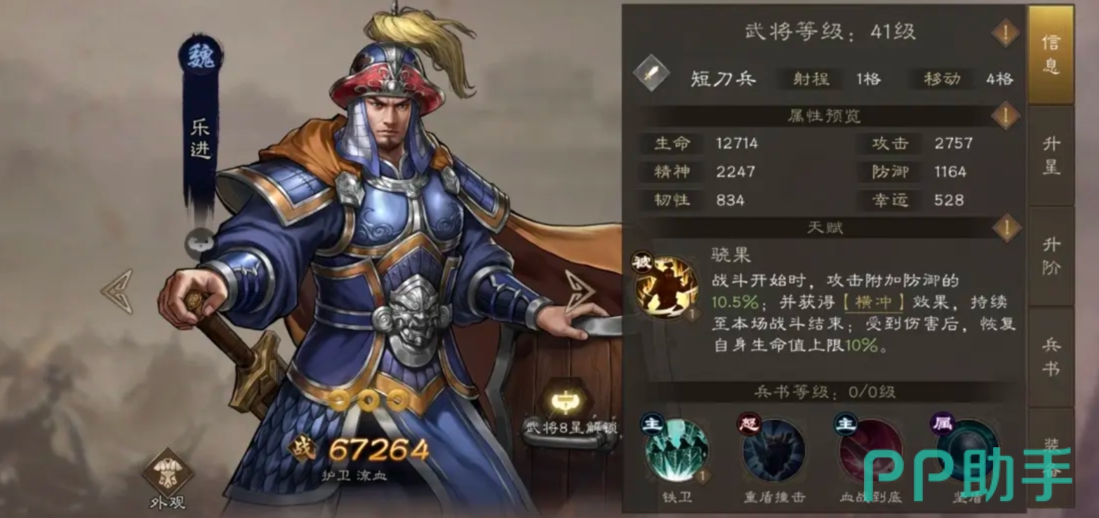 乐进,在曹操阵营中,与他一同作为步兵代表的还有李典、曹洪等,而在众多人选之中,之所以选择乐进作为主要培养的步兵对象,是因为他在三人之中初始统率相对较高,众所周知,步兵作为战斗队伍中的前排主力,承担着抗伤害的重要职责,而统率越高,意味着防御力越强,在为乐进搭配宝物时,玄铁双鞭、雁翎锁子甲与青囊书的组合堪称经典。