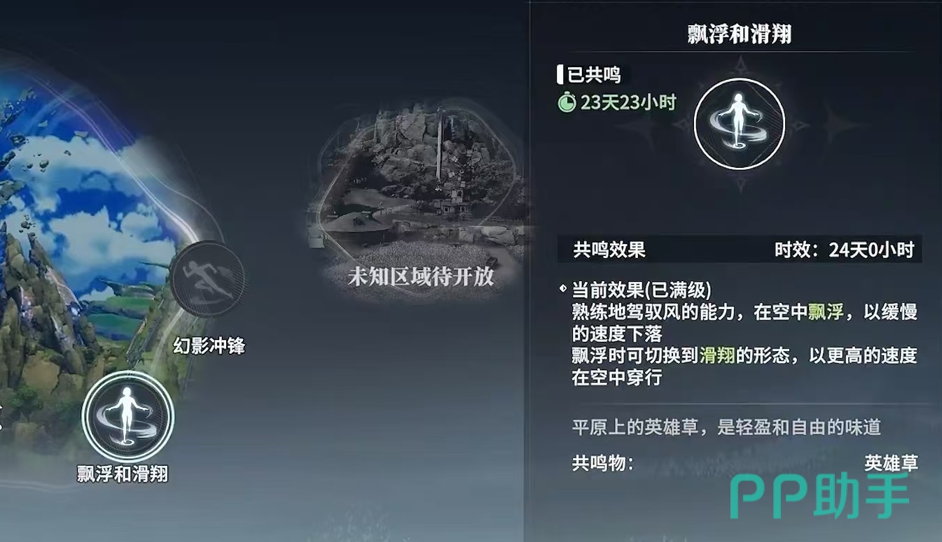需要先传送来到对应的位置,然后跑路找到这株巨型植物,靠近之后就可以进行交互了。在共鸣之后就能够解锁漂浮和滑翔能力。效果是能够熟练驾驭风的能力,在空中漂浮,缓慢的速度下落,漂浮时可以切换到滑翔形态,这样就能够以更高的速度在空中穿行,也就是大家所说的飞行。