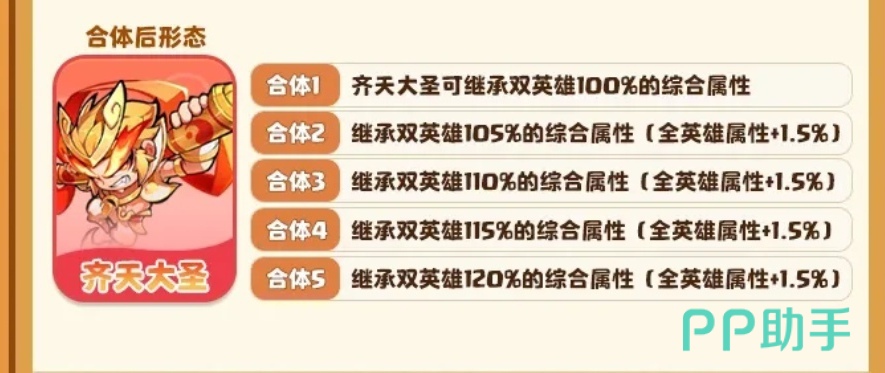 这个角色合体之后的形态是非常强大的,可以来继承双英雄的100%综合属性,如果合体乘以二就可以来继承双属性英雄的105%的综合属性,可以增加百分之1.5,不断的提升能力,就可以更好的继承英雄的综合属性,对于许多玩家们来说,是用这个魔宠成长的空间也是非常大的,可以来更好的搭配升级。