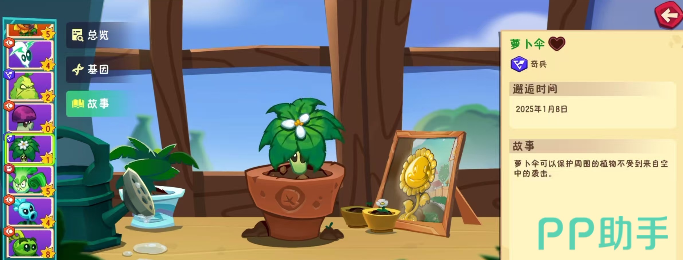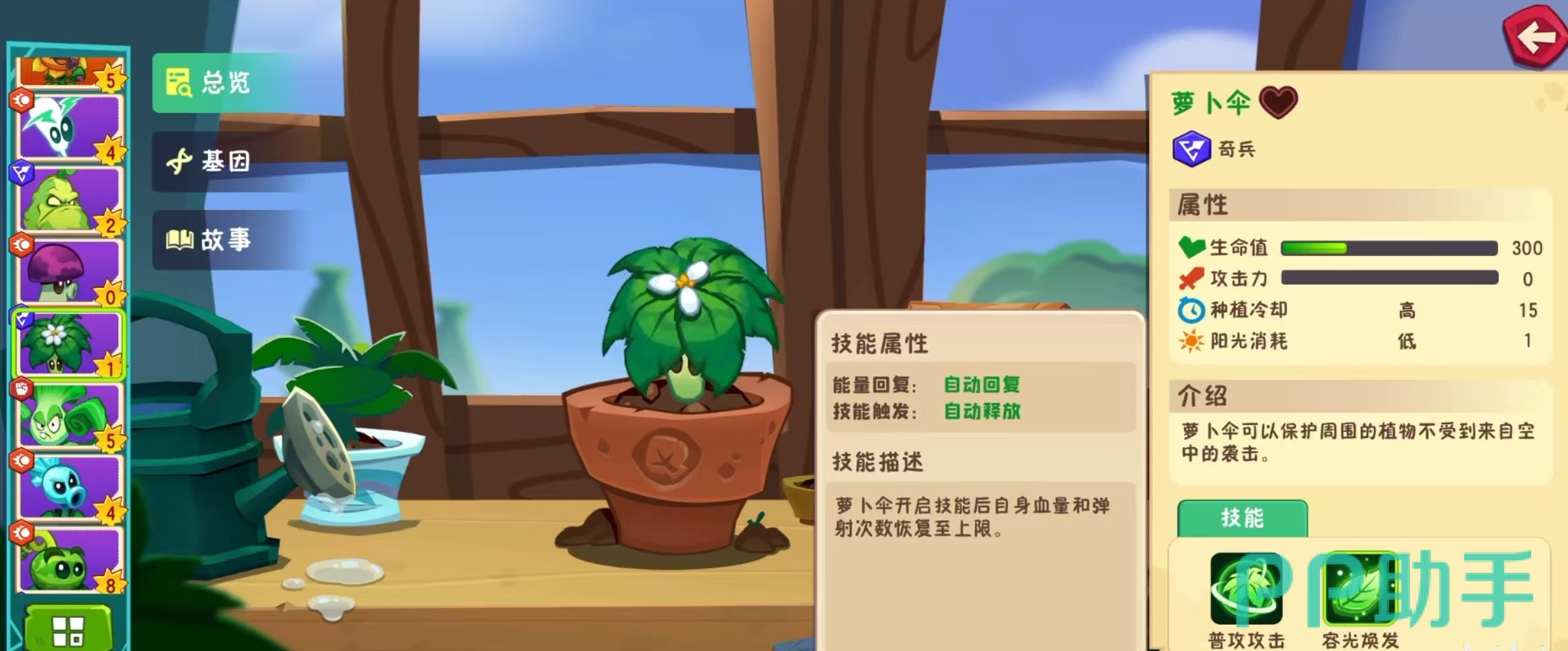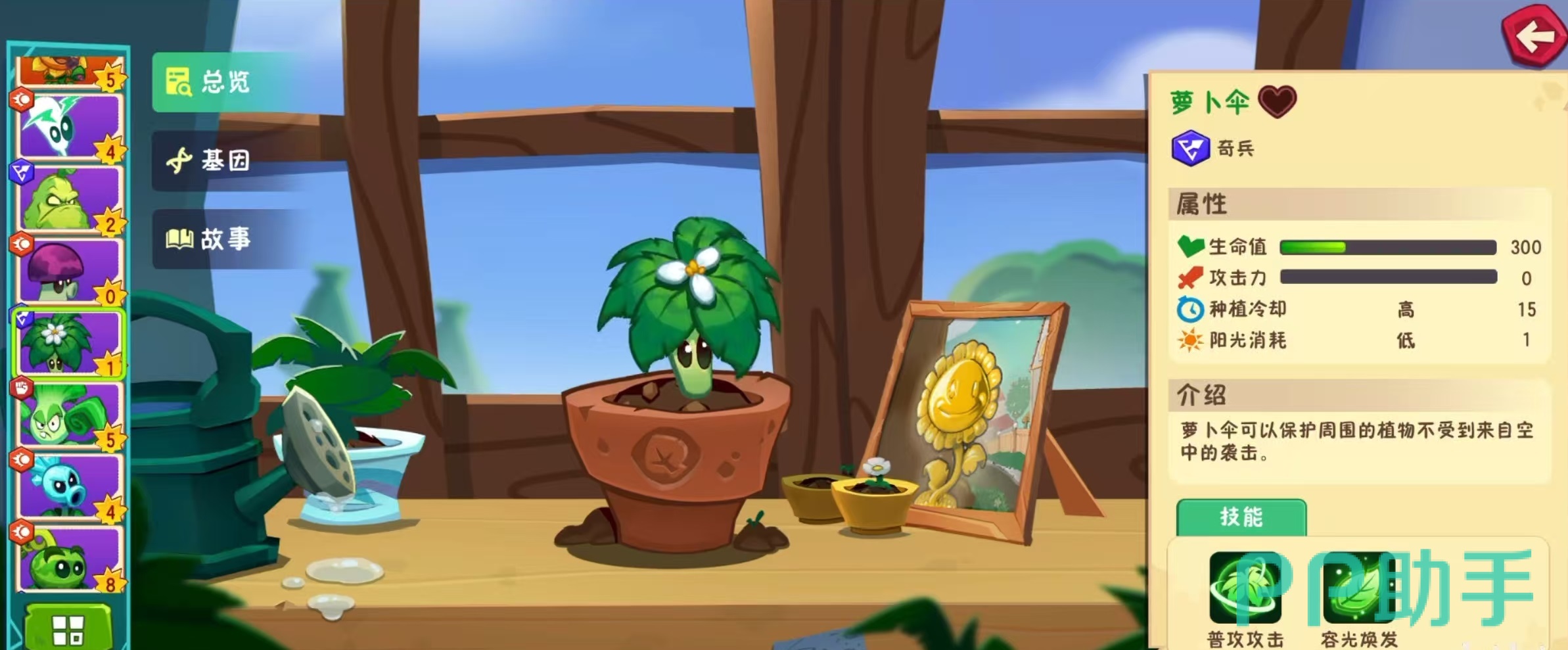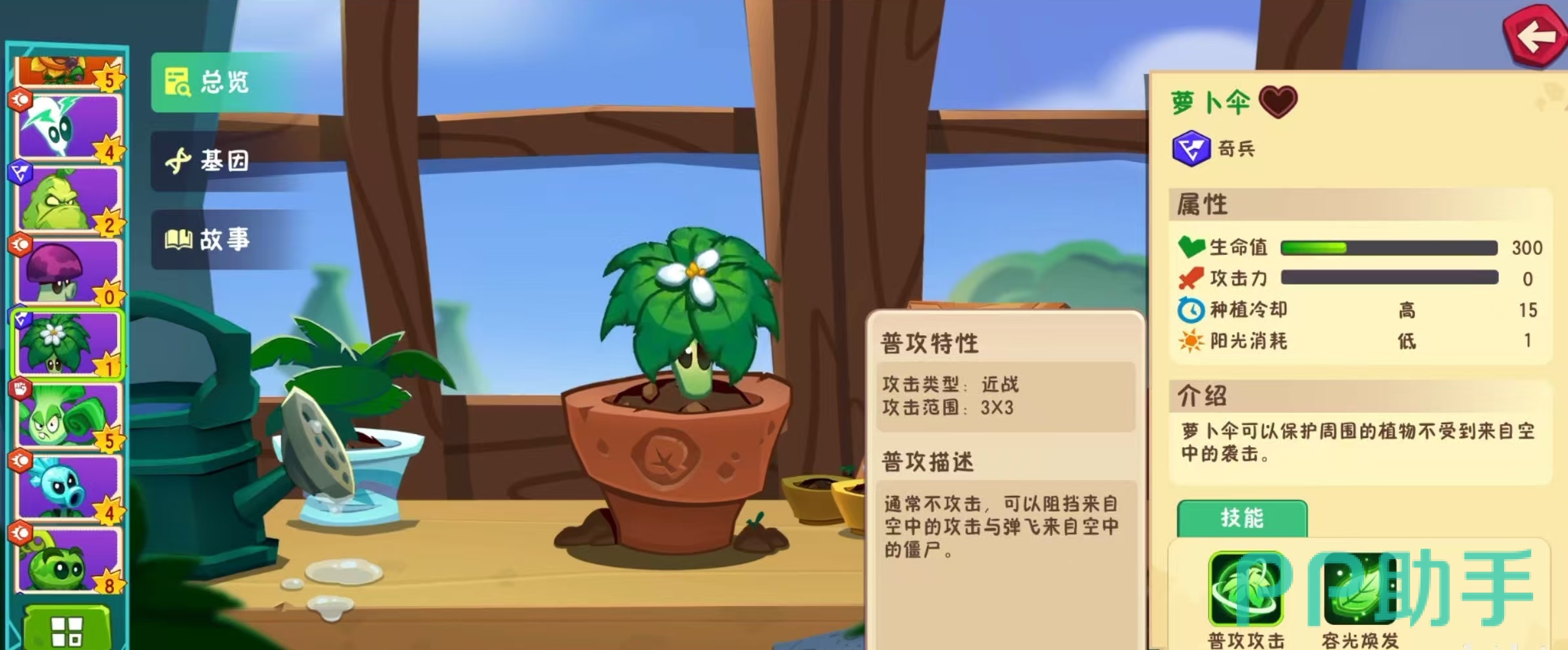 萝卜伞曾经是一个胆小鬼,直到它找到自己的使命守护之后,现在已经成为了可以保护植物们的好大哥。当玩家在通关城区第6关之后,就可以获得萝卜伞这个植物。需要消耗1点阳光,种植冷却时间比较长,生命值较低。它的能力是可以保护周围的植物不受到来自空中的袭击。通过这个技能效果特点不难看出,这个植物还是有着很关键作用的。因为在游戏中并不是完全的地面战斗,很多时候要面对来自各个方面的攻击,空中攻击也是一类。