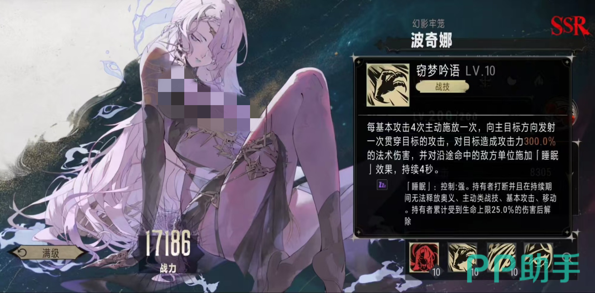 特性效果是拥有睡眠的敌方单位,如果因为受到伤害而提前苏醒,那么波奇娜给目标添加上受到伤害提升效果,持续6秒钟。如果没有提前苏醒,那么在睡眠持续时间结束后,为目标添加全系伤害降低效果,持续6秒钟。也就是无论对方是否提前苏醒,都会受到很大的影响。所以波奇娜在伤害和控制方面,都是目前非常出色的人物。