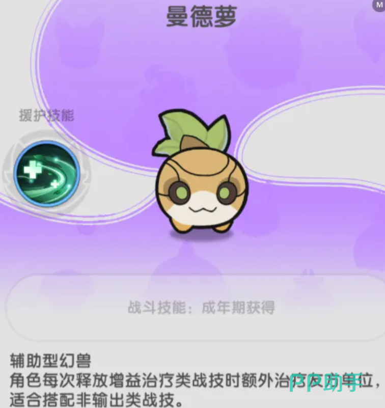 曼德萝也是辅助型,它的“自然之力”能在角色对自己的队友释放战技时,自身对其中一个目标进行一次治疗,这个毫无疑问就只适合奶妈型的贤者,这样能招式能和奶妈的治疗技完美匹配,并且升到最高品质它带来的奶量是非常高的,可以说是治疗类神宠。
