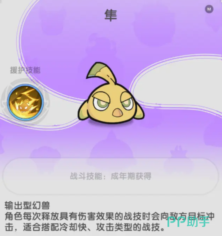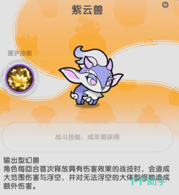 紫云兽也是输出类,它的被动能在角色释放有伤害能力的战技时,对其中1个目标及其1格范围内的所有敌人造成光元素伤害并浮空,浮空能让敌人无法反击对大体型无效,但对大体型目标造成的伤害会提升20%,这个适用于术士的附伤流派,因为造成伤害就能追加一次光伤,术士的攻击频率高会有不错表现。