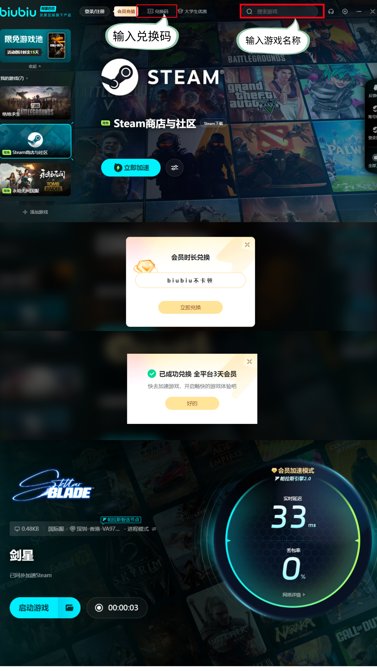 新用户登录注册立刻就可以得到24小时加速服务,此外平台给每个用户都提供了三天加速时长,但是需要在兑换码专区手动输入【biubiu不卡顿】才能领取,若是感觉体验效果不错的话,可以考虑长期使用,后续首次充值还可享受超低折扣。