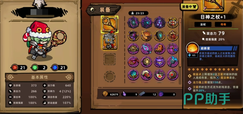 这里武器用的“日神之杖”,可以聚集大火球造成范围伤害,附魔这里重点是两个,一个是能量点上限加2并且卫星对碰到的敌人造成伤害会被视为魔法弹攻击,还有一个就是卫星的射击方式改为射线攻击,并且伤害提升20%。