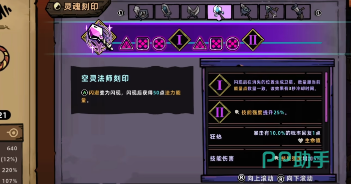 还可以在刻印的镶嵌槽中带上暴击回血,常驻满层的吞噬之牙,武器和衣服只要有附魔合适的就可以,选择较为随意。这套空灵刻印卫星流打无伤比较简单。