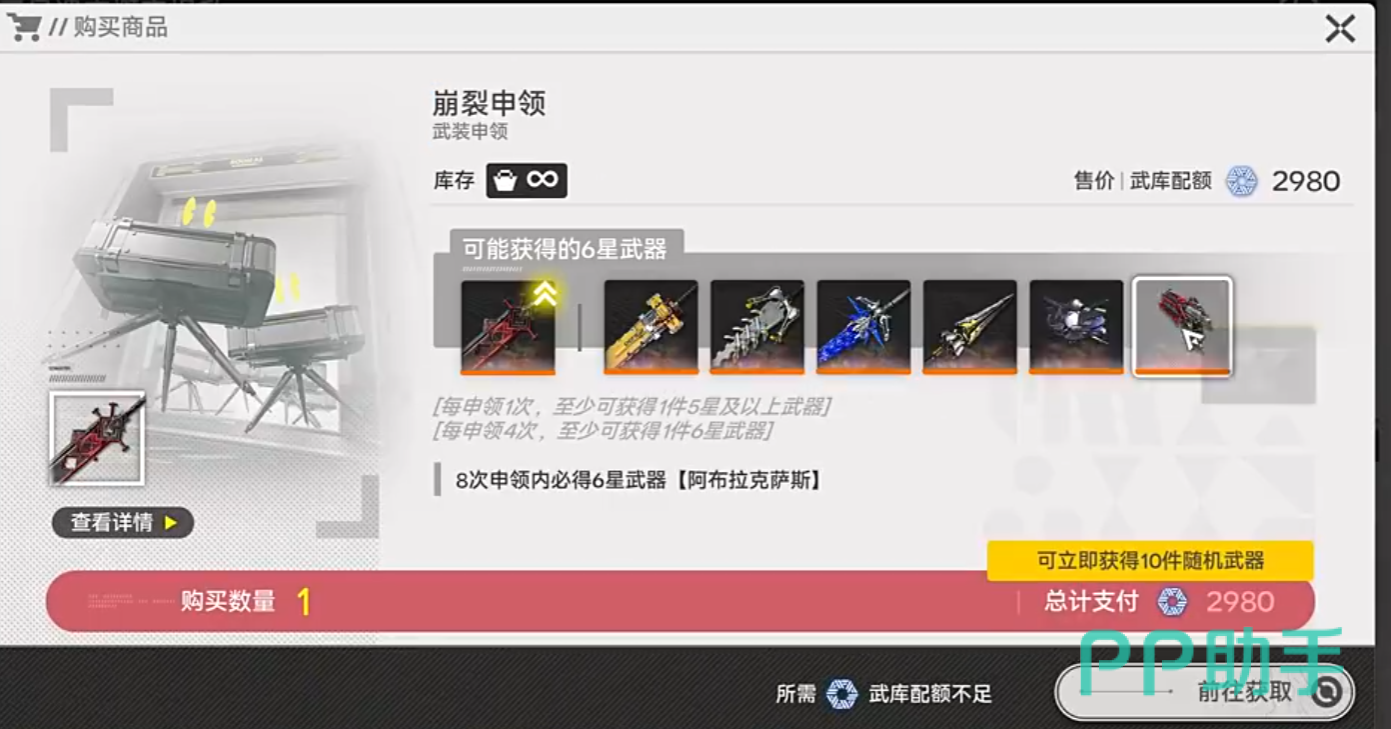 武器卡池需要2980的武库配额,才能来上一次10连抽,每10连最少能获得一件5星级武器,每40次必定一件6星,80次必得该卡池中的限定6星,此外在武器卡池中有个限定特卖,能直接花费一定武库配额来购买一个六星。