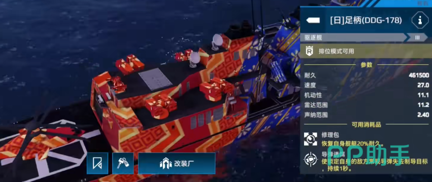 首先是当前版本最为推荐的驱逐舰:055型驱逐舰。这艘船凭借其全能型设计成为新手首选,拥有高达44万的耐久,与部分战列舰相当,速度快、机动性优秀,同时配备火箭炮与鱼雷,具备不俗的对舰打击与自保能力。其防空能力也相当可靠,加上赠送的海景涂装,性价比极高,几乎是新手阶段最全面的选择。