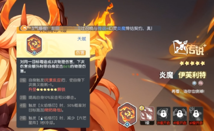伊芙利特拥有奥术飞弹的强大清场技能,输出范围广且稳定,解锁天赋后可运用元素反应奥义,天赋能施加带有减防效果的火焰烙印,进一步提升伤害,站位处于后排,与坦克和近战输出保持一定距离,防止敌方近身,同时利用自身射程优势,对敌方进行远程打击,可站在团队后排两侧扩大攻击视野,避免被敌方范围技能轻易波及。