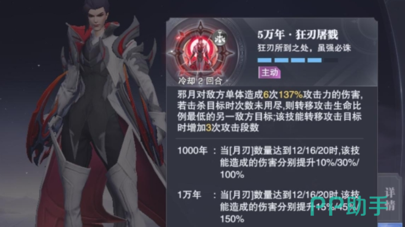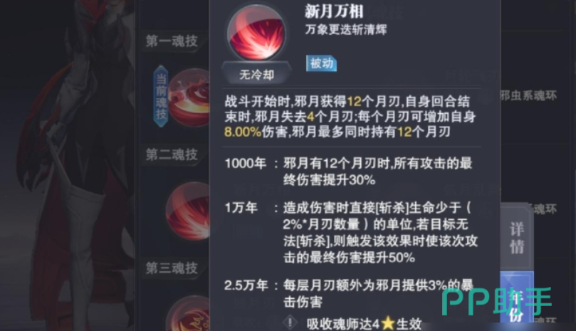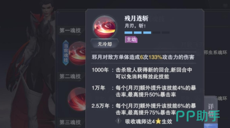他的一技能残月连斩,在每次击败敌人之后,可刷新技能cd,拥有着高爆发的效果。在第1次伤害的时候效果是最强的,因此大家释放之前务必要瞄准。1000年魂环时,每次击杀敌人可开启新的回合,并且在新回合中可以免cd再放一次。达到1万年之后,暴击率可提升4%,最高至50%。2.5万年时,暴击率可提升6%,最高可达75%。而当达到5万年的时候,最高能够提升至百分百。