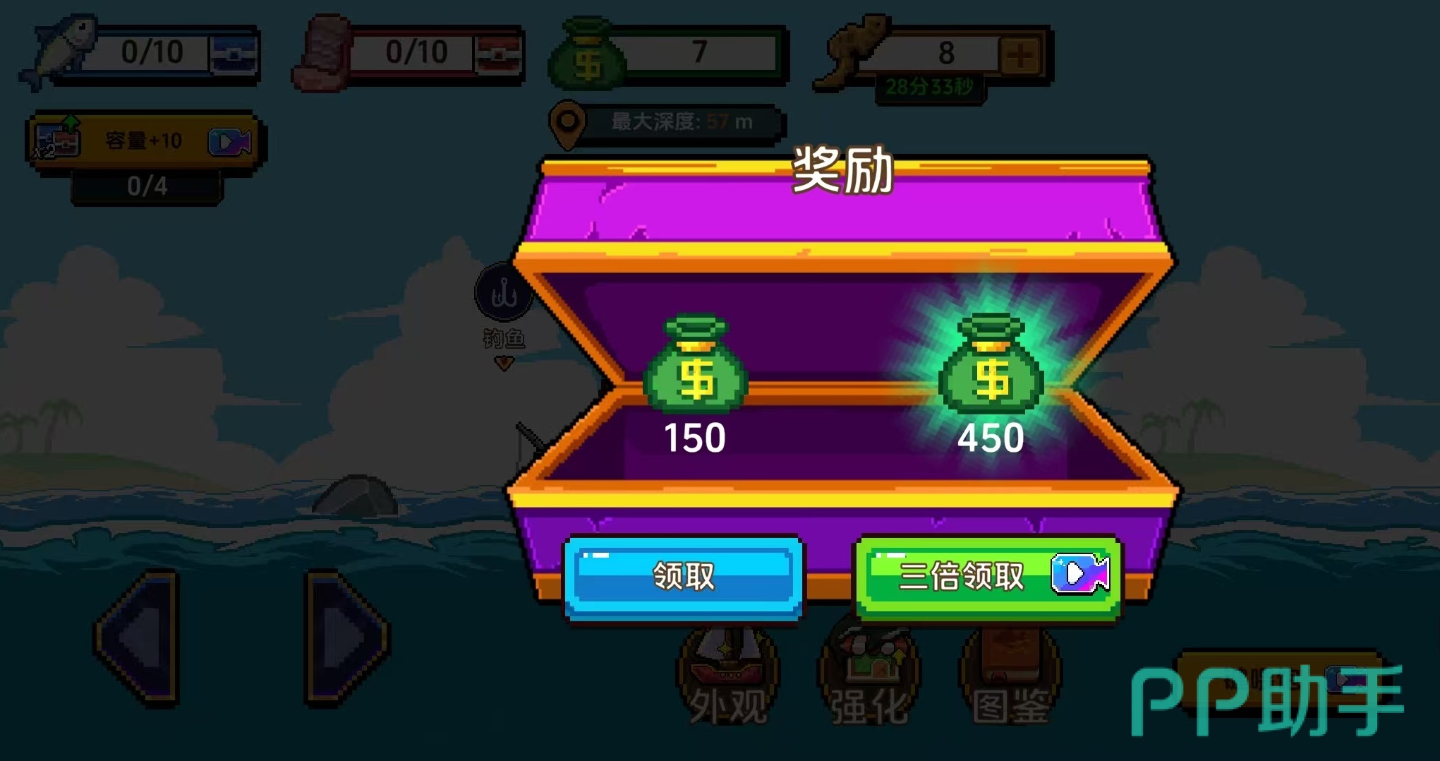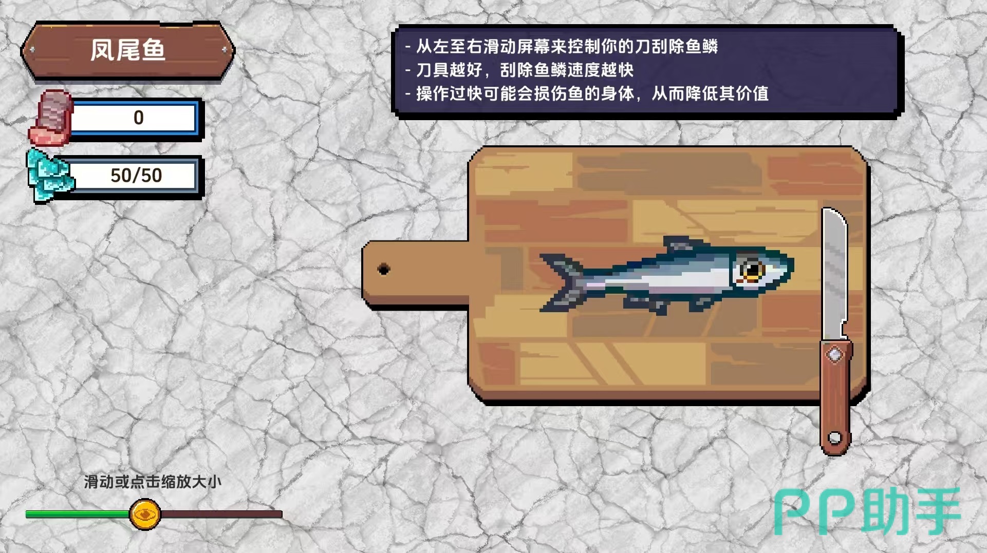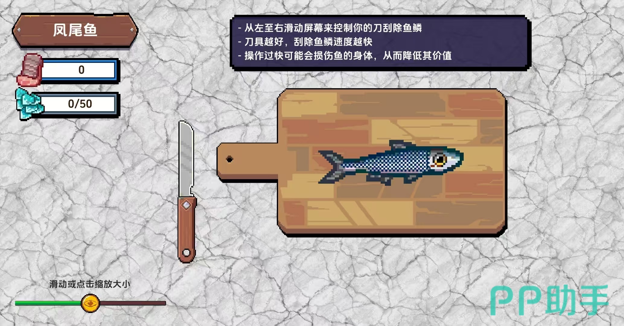 大家都非常清楚这款游戏的精髓玩法就是通过往海下扔鱼钩,然后钓出鱼加工好成为美食,在这个过程中还需要先进行处理,就是刮去鱼鳞。首先大家在钓到鱼之后,需要把鱼带到船里的案板上,然后使用刀具刮鳞。具体的操作就是从左到右滑动屏幕,这样就可以操纵刀具进行刮鳞处理了。