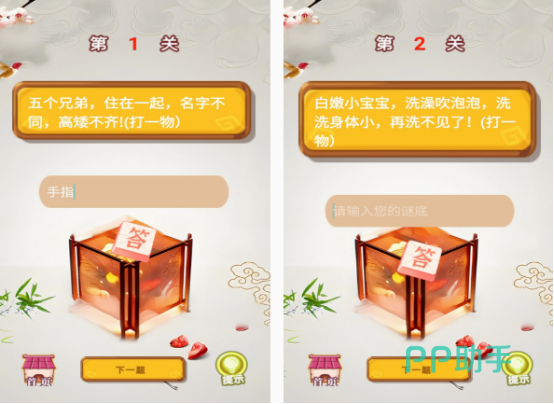 这款以古代灯谜为主要内容的闯关手游,在每次关卡中,都会以文字的方式将题目显示出来,需要根据题目将需要打的物品名字输入其中,就可顺利完成任务。具有简约的游戏设计,以及分组的题目,想要在玩的过程中,发挥自己的智力,此游戏设计的超多的题目内容,通过经常挑战游戏猜谜的方法,既可让自己的经验越来越丰富,还能够提升自己的水平。