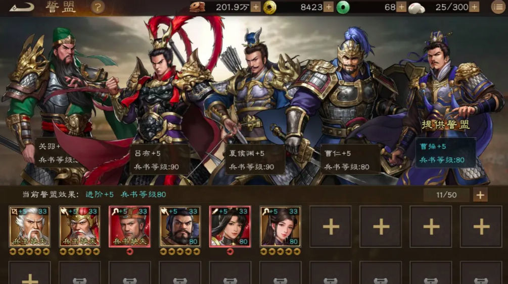 第二个玩法是誓盟,玩家可对5个主力武将进行升级,然后将金将放置在誓盟当中,此时这些金将,就会对等级最低的武将等级进行继承,要想提高誓盟的战斗能力,一定要给角色增加技能书。