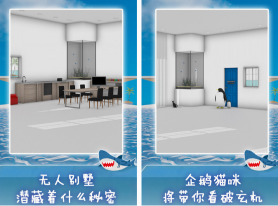 这款置身于以海景这样的密室环境,为主要内容的逃脱游戏中,可看到相对于大家熟悉的各种密室逃脱系列手游,在背景方面有很多与众不同之处。既可看到隐蔽的别墅,还可看到湛蓝的海洋,在画面上主要就是以浅色调为主,还有长相特别可爱的企鹅,甚至是猫咪。置身于无人的别墅以后,通过不断探索找到隐藏的秘密,才可让自己逃离。