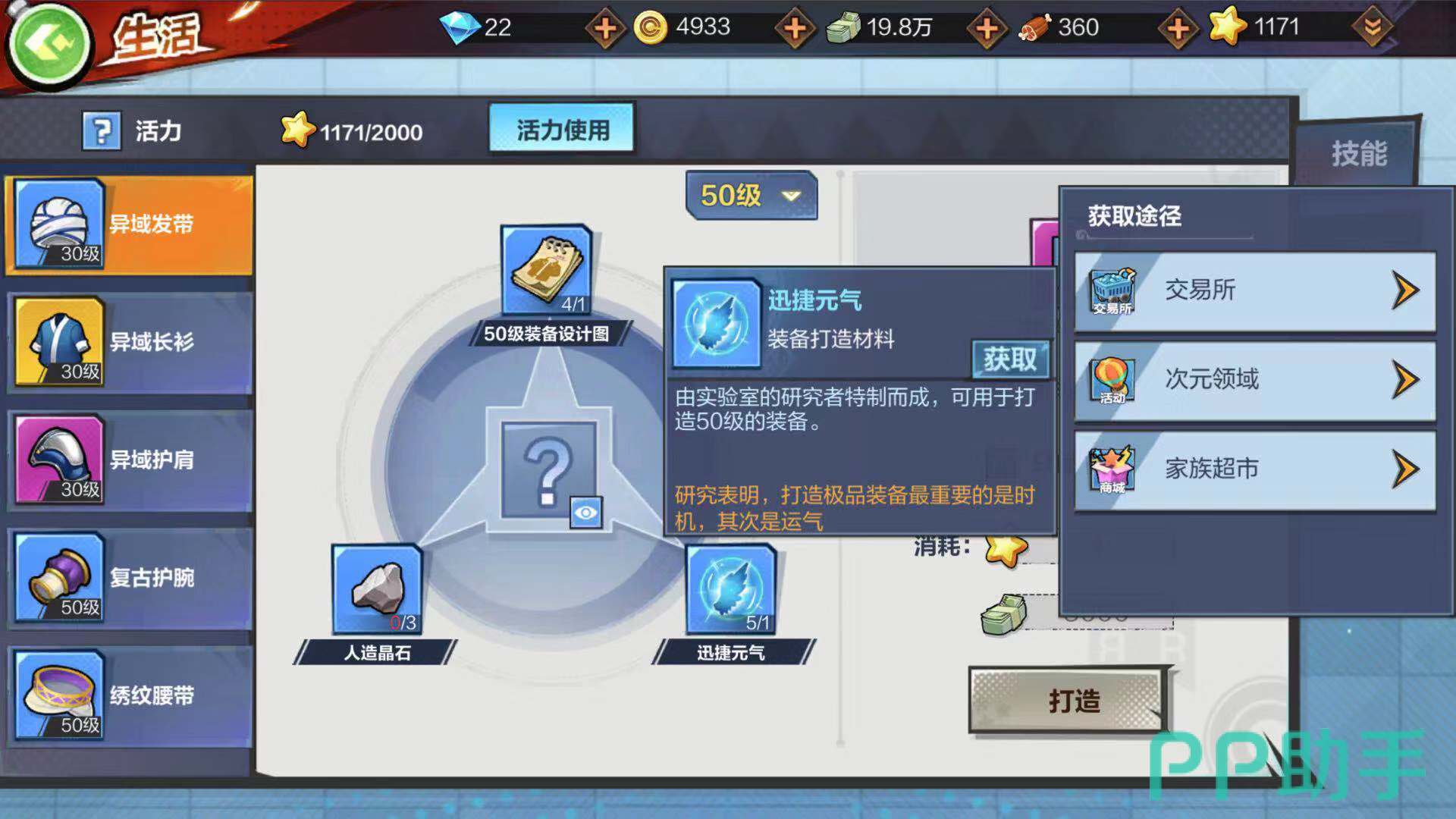 点击右下角的生活,等机够了就会解锁打造菜单,来到打造菜单可以看到需要设计图,人造晶石和迅捷元气。