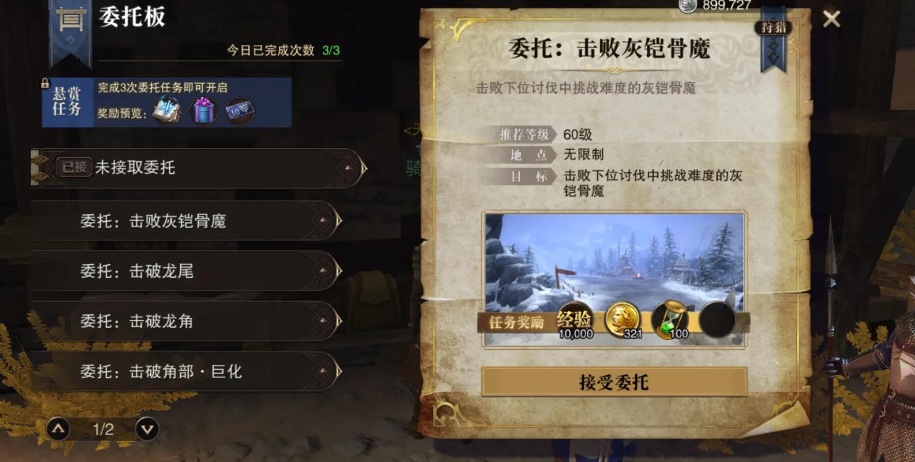 我们首先就注意刷新机制与时间。每日5:00刷新3次免费接取机会,优先选择讨伐类任务(限时2小时完成),避开耗时4小时的采集/护送任务。刷新时若未出现5星任务,消耗悬赏刷新券(每日上限20张)直至刷出高星目标。讨伐任务推荐接取剿灭风狒狒群这类,怪物密集且无机制要求,单人3分钟内可完成,5星任务如“讨伐万年魔猿”需组队,奖励猎魔者之戒(激活猎魂惩戒技能)。