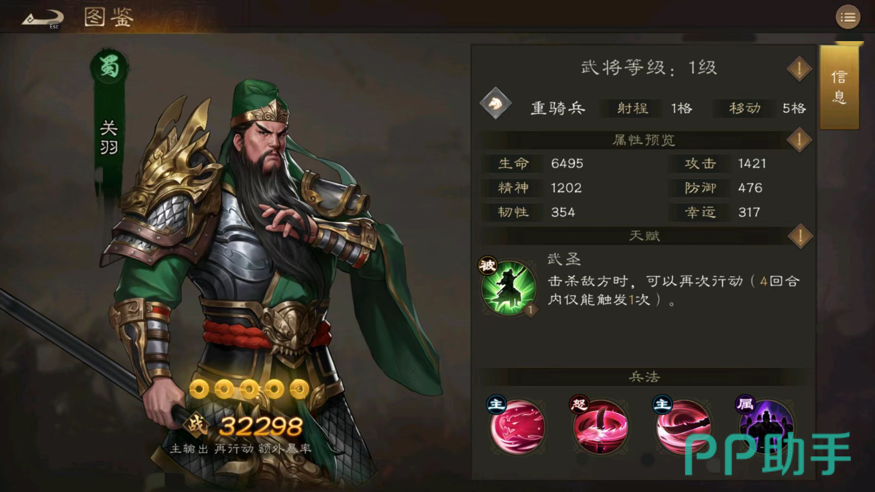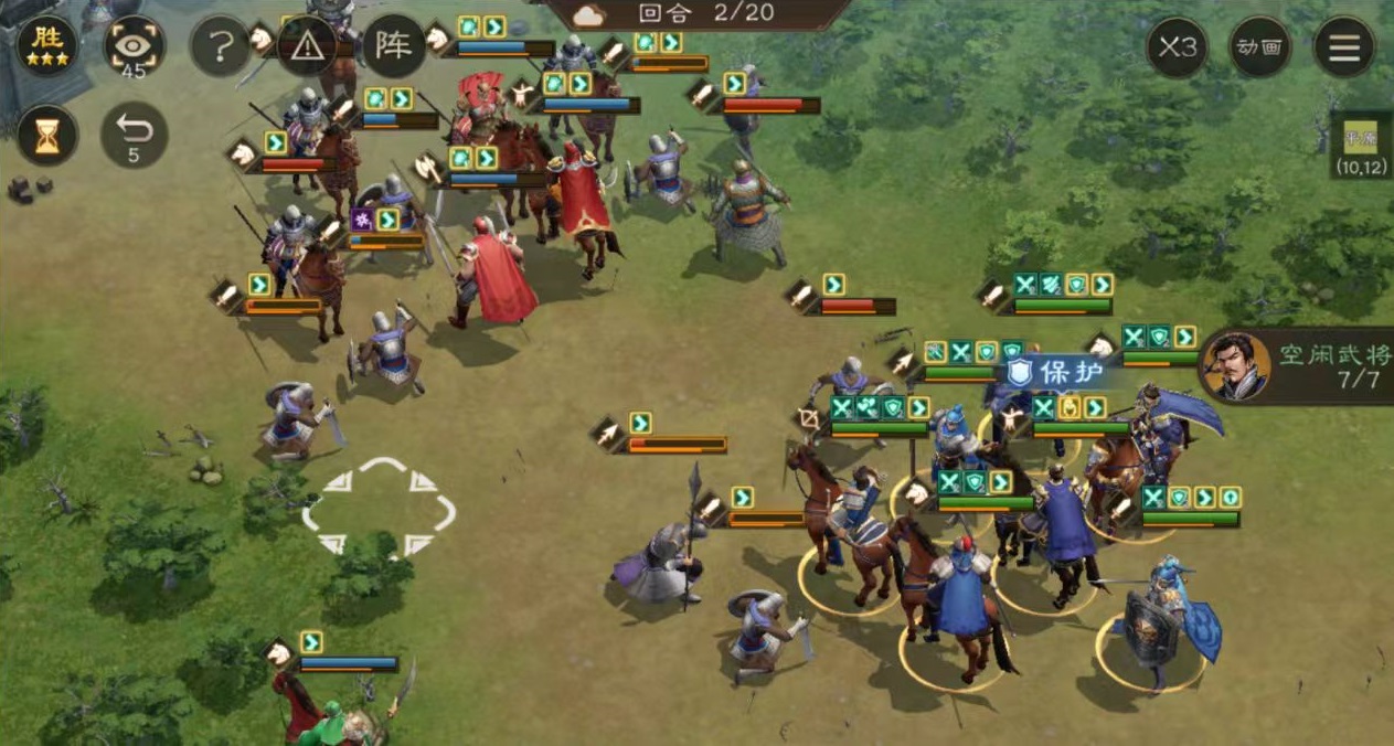 战斗开始时自身触发万人敌,持续两回合,场上每有一名敌军,张飞的兵刃伤害就能增加10%,兵刃减伤增加5%。这就意味着张飞非常适合在人数较多的战斗中使用,开场直接属性大幅度飙升,非常狂暴。主动技能是长板怒吼和万军取首。长板怒吼的伤害是直线3×3范围,所有敌方都会受到兵刃伤害,并为其施加脆弱和怯阵效果。万军取首能造成大量伤害,并按照此次伤害的百分比来恢复生命值,这样张飞就有了持续战斗的能力,所以承受伤害也不怕。