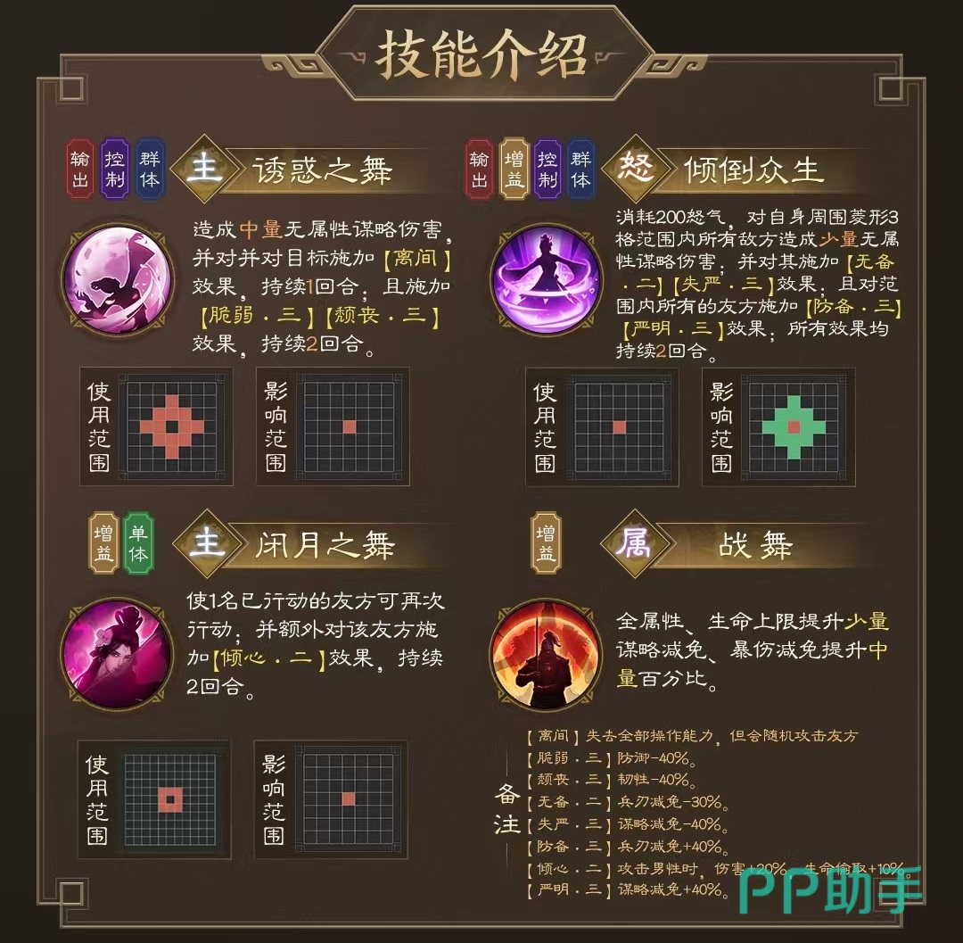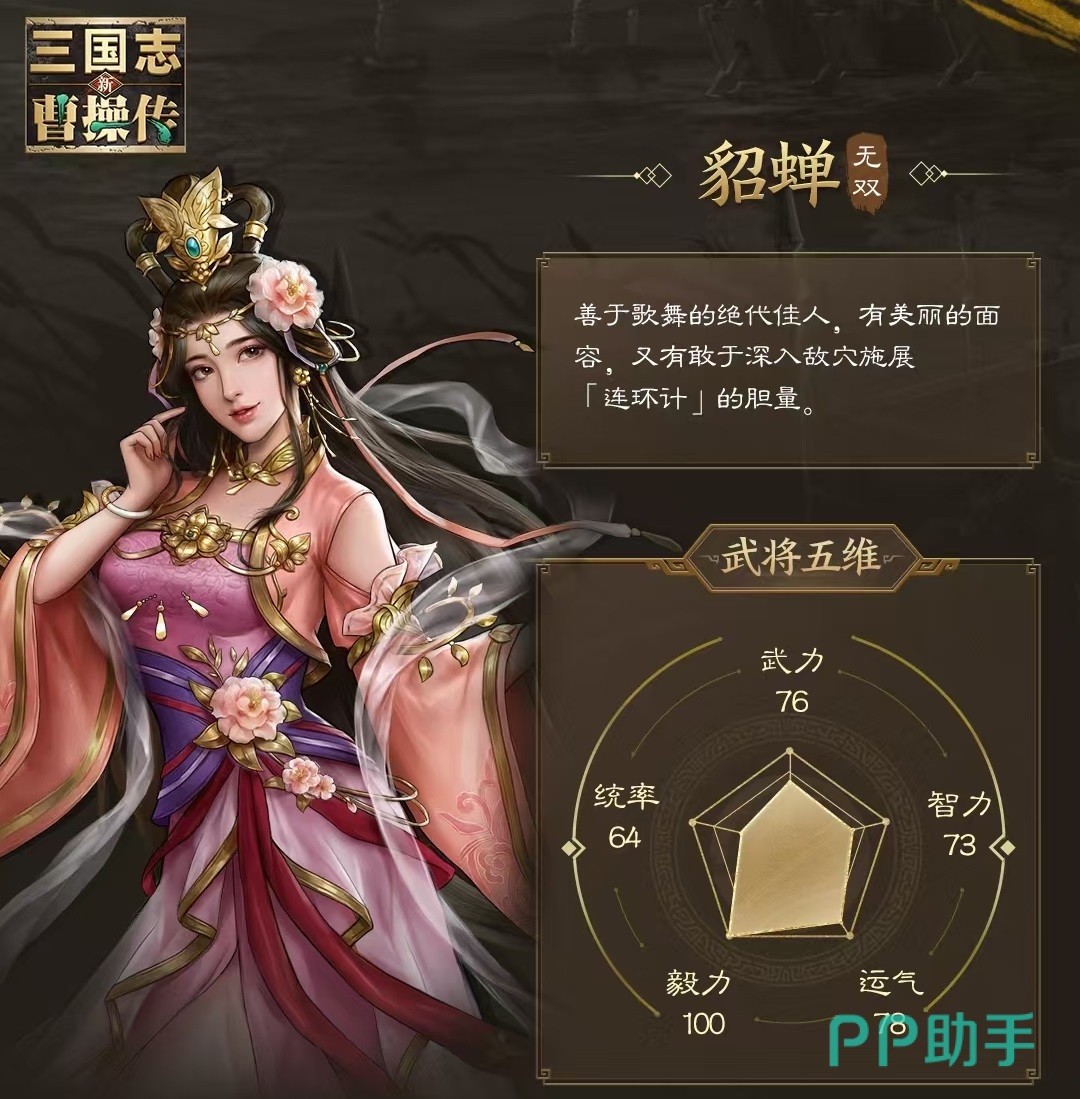 以上就是今天小编给大家带来的新三国志曹操传貂蝉技能介绍,现在大家不仅清楚了这个武将所具有的技能效果,还知晓了如何进行阵容搭配,大家如果想要使用,可以按照小编介绍的去进行操作,最后的强度绝对不会失望。