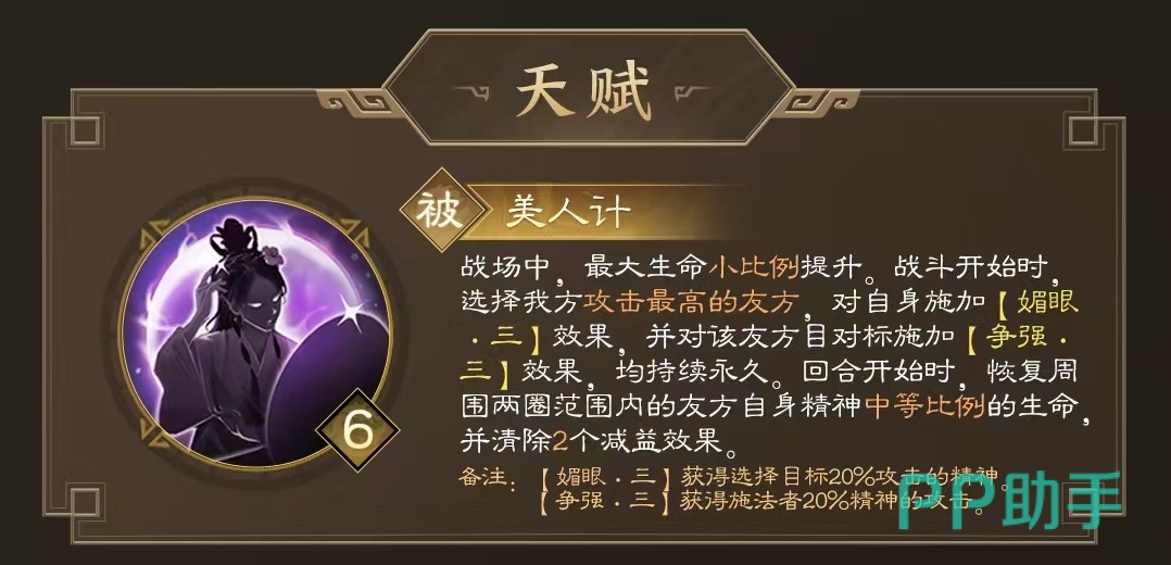 在游戏中,貂蝉是一名及辅助和控制于一身的武将,它可以使一名友军再次行动,展现出了自身强势的策略性和不可替代性。在五维属性方面,毅力直接拉满,其他属性中规中矩。自身的天赋美人计,在战场中最大生命值小幅度提升,战斗开始后会选择一个我方攻击最高的单位,获得选择目标20%攻击的精神属性,并对该目标施加自身20%精神的攻击加成。这两个效果都是永远持续的,在回合开始时,会恢复自身周围两圈范围内的友方生命值,并清除两个增益效果。