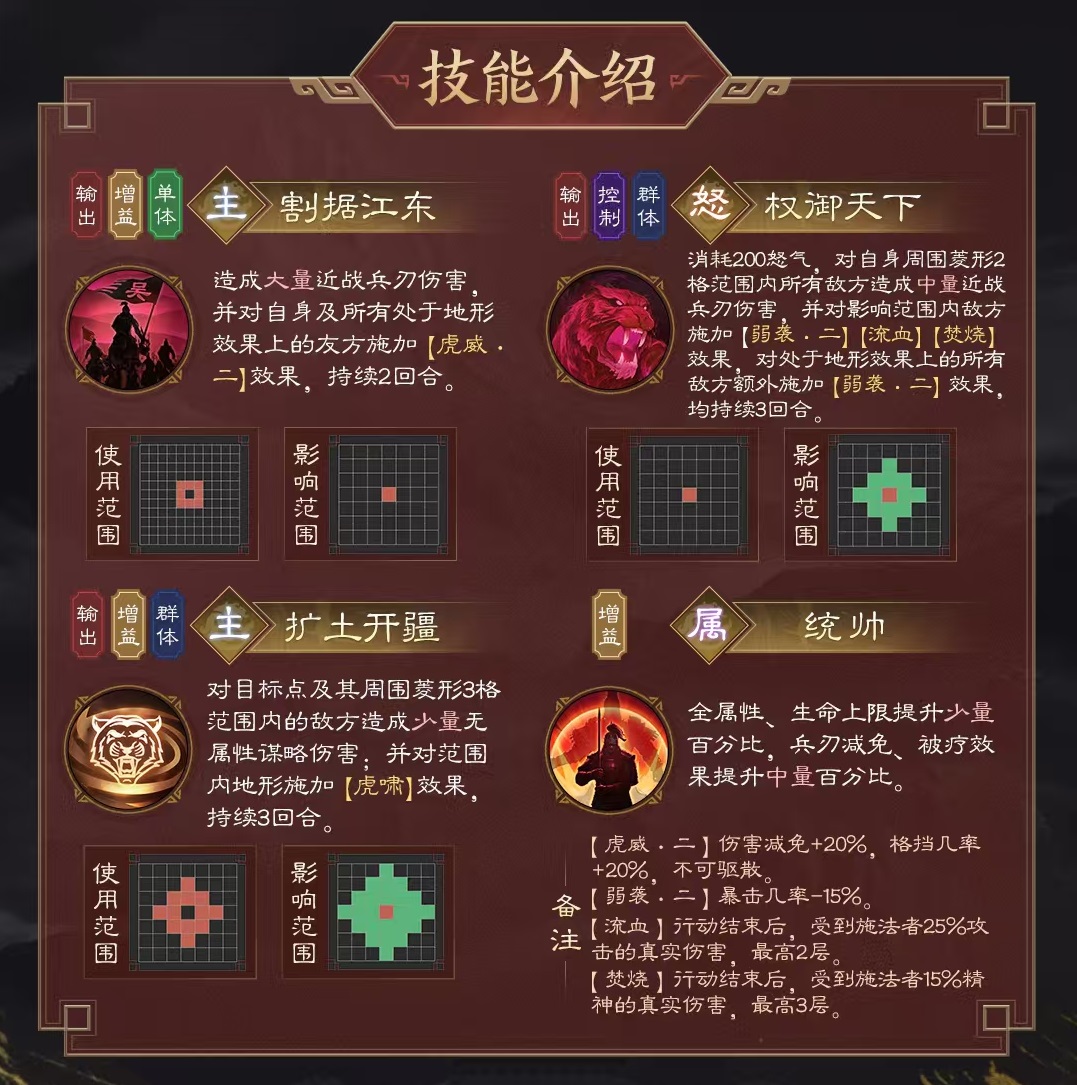 两个主动技能分别是割据江中和扩土开疆。割据江东能对目标造成大量近战兵刃伤害,对自身以及所有处于地形效果上的友军施加虎威效果,持续两回合。被虎威影响的目标,伤害减免提升,格挡几率提升。扩土开疆对目标点及周围菱形三格范围内的敌方造成无属性谋略伤害,并对范围内地形施加虎啸效果,持续三回合,这里的虎啸和天赋所附加的是一样的。大招权御天下,对自身周围菱形两格范围内的所有敌方造成近战兵刃伤害,并为敌方施加弱袭、流血、焚烧等效果。