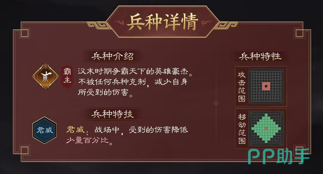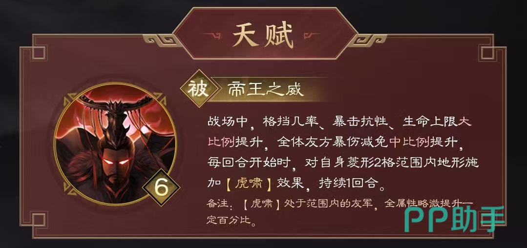 孙权在属性方面虽然没有非常抢眼的地方,但各个属性均衡,这一点也难能可贵。自身还有一个很有特点的地方,就是自身的兵种特性,不会被任何兵种克制,能减少自身受到的伤害。天赋是帝王之威,在战场中,孙权的格挡几率、暴击抗性和生命上限都能得到大幅度提升,全体友方爆伤减免中比例提升。回合开始时,对自身菱形两格范围内的地形施加虎啸效果,持续一回合,被虎啸所影响的友军全属性略微提升。