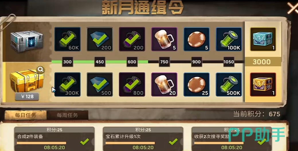 如果玩家们能介绍较高的氪点,那新月通缉令是很不错的充值内容。通缉令是对应每日任务的,建议玩家们在登录后能达到每日任务的各个分支任务,获得通缉令给予的全部奖励,这些奖励道具都是玩家在游戏需求度较高的道具。
