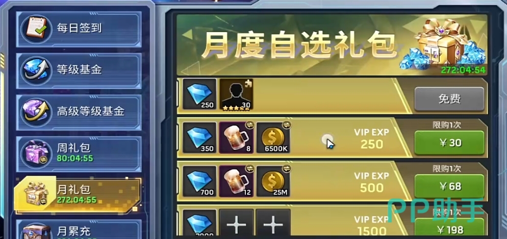 游戏中最为值得玩家们选择的就是月度礼包了,不过游戏中在月卡上给了玩家很多的选择,其中免费的礼包是自选的,建议必选啤酒,30元一档的可以考虑。充值月卡同样也计算进累计充值礼包中。