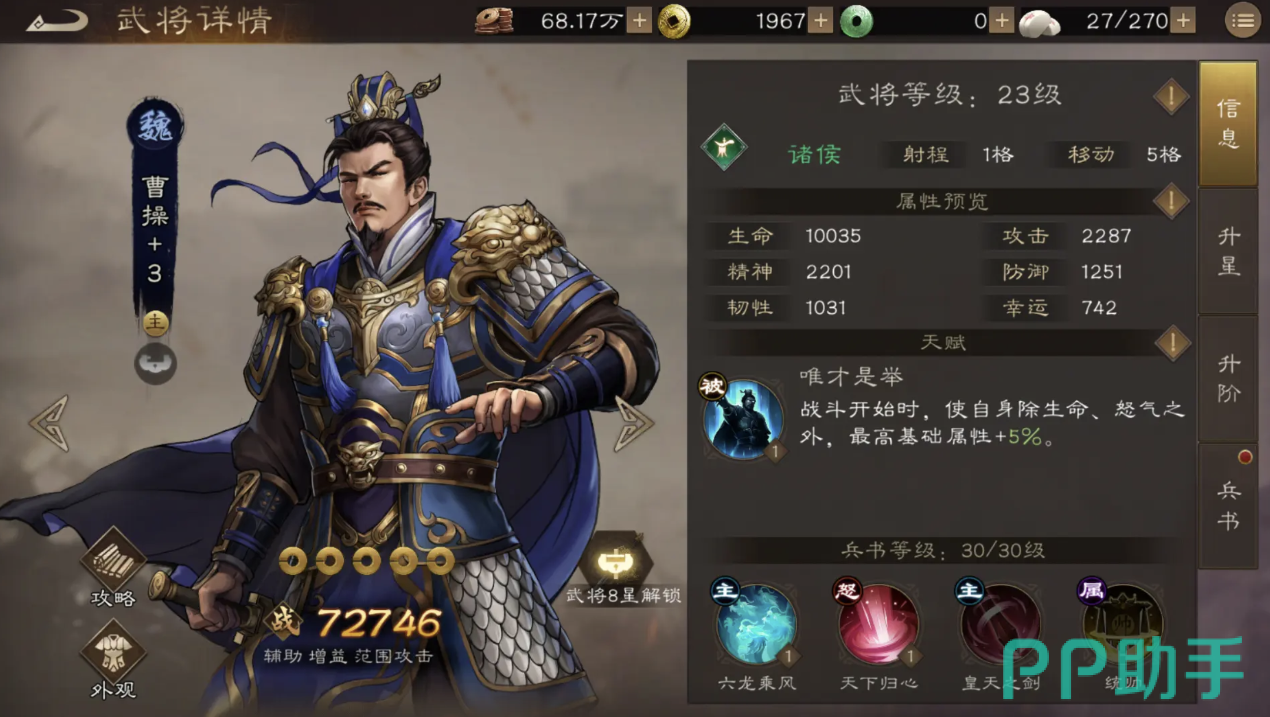 辅助方面优先考虑曹操,曹操的天赋在战斗开始时提升自身最高属性,间接带动全队输出。他不仅能加BUFF,还能与夏侯渊组成魏国组合。曹操在开服第二天系统就送本体,升星快、养成轻松,是非常友好的开荒辅助。