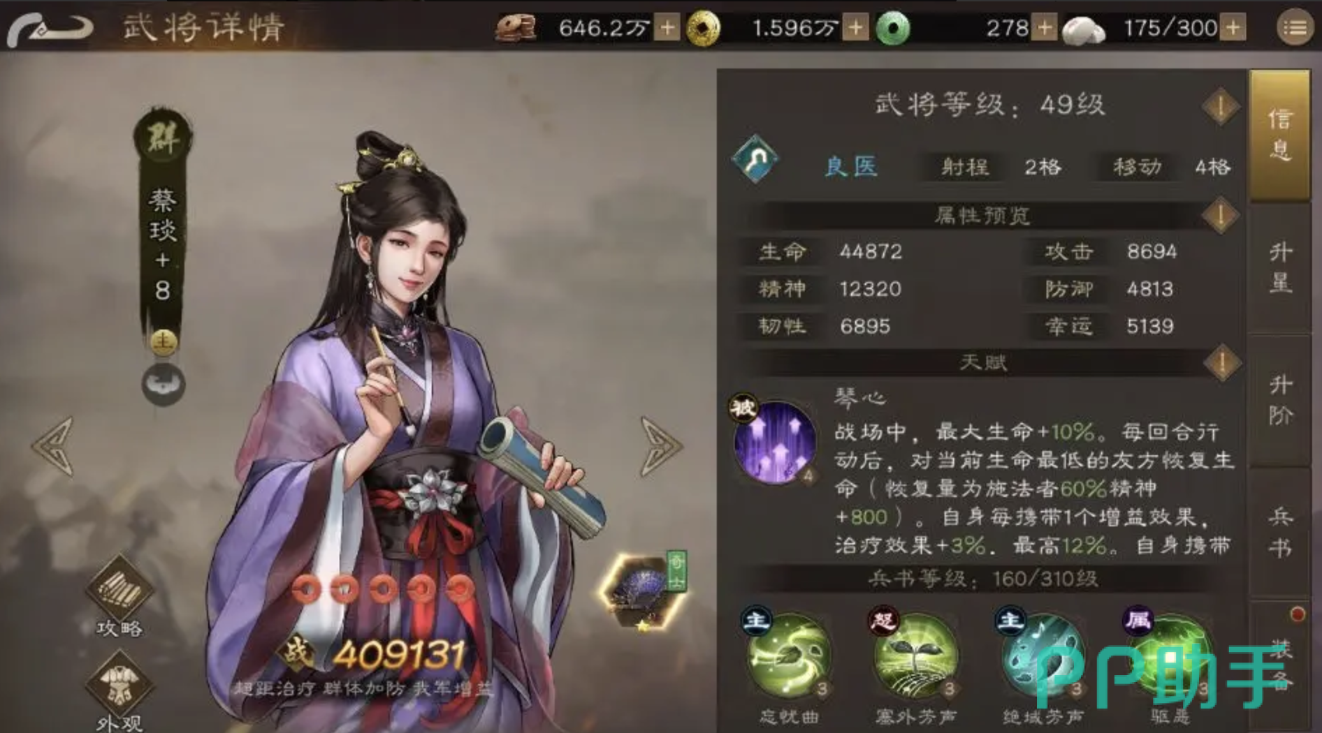 治疗位推荐蔡琰,蔡琰是目前奶量最高的医生,每回合都会自动治疗队伍中血量最低的成员。虽然抽卡概率不算高,但前期可以先用赠送的华楹顶替,等蔡琰到了再替换,过渡也很平滑。