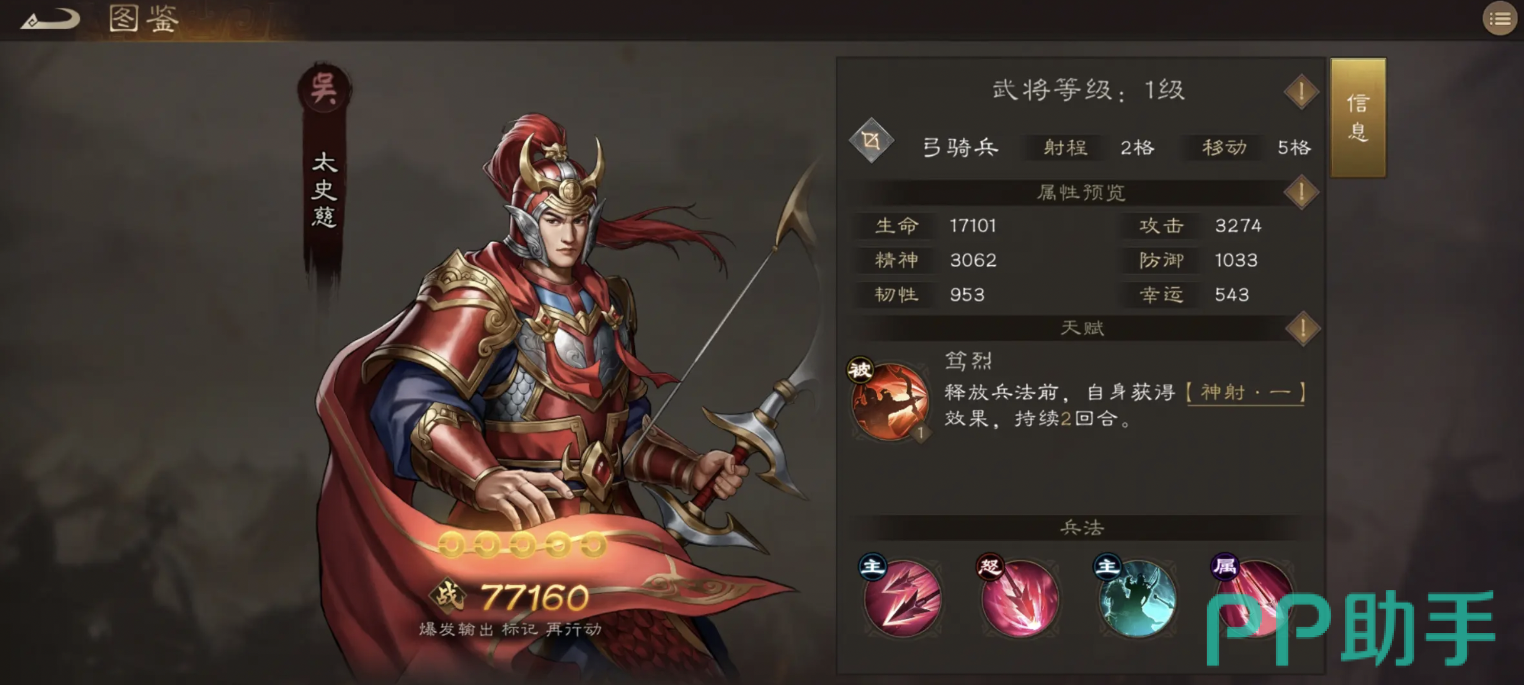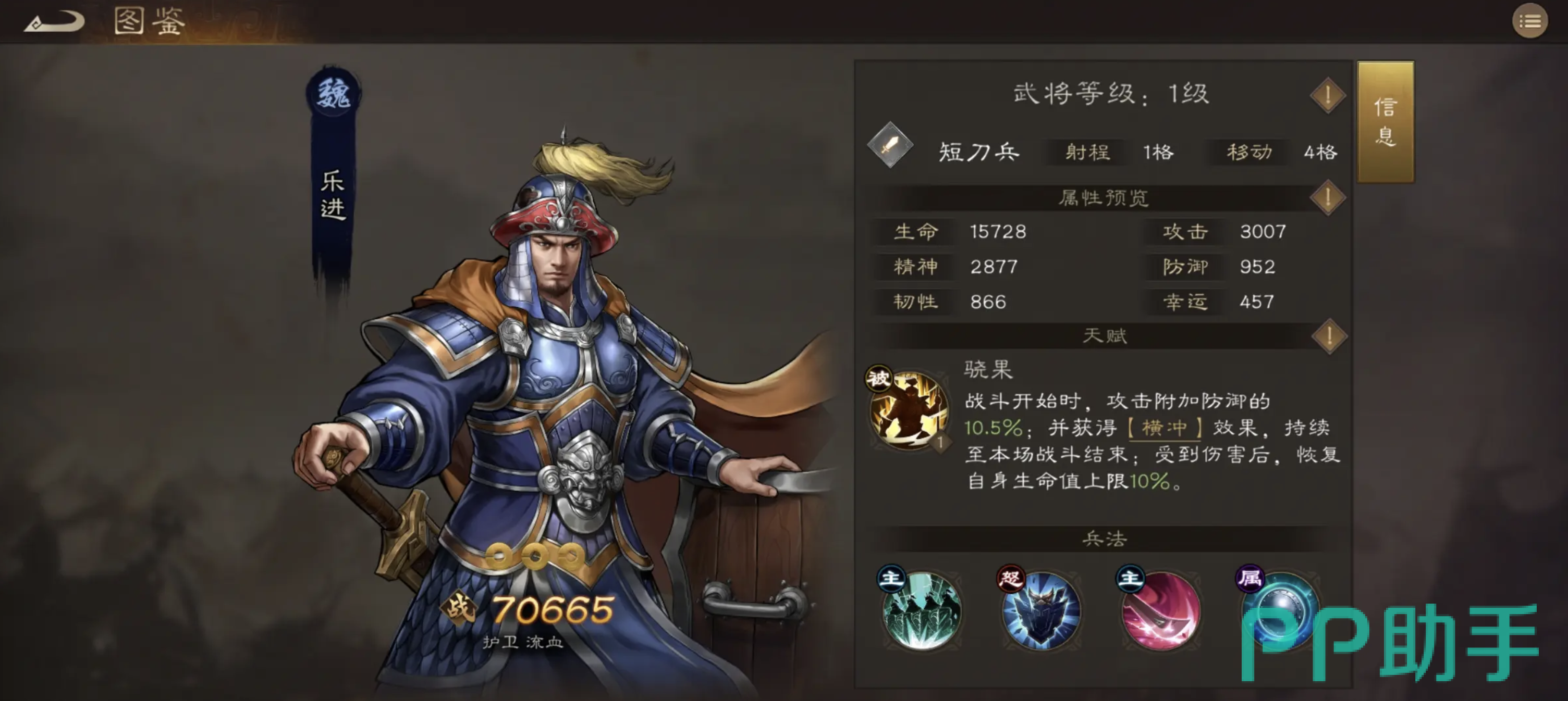 前期肉盾也很关键,推荐使用紫将乐进。虽然是紫卡,但非常耐打,挨打能回血,只要不是被秒,基本打不死,是前期最适合的“平民战神”,后期还可以把他换成输出位。