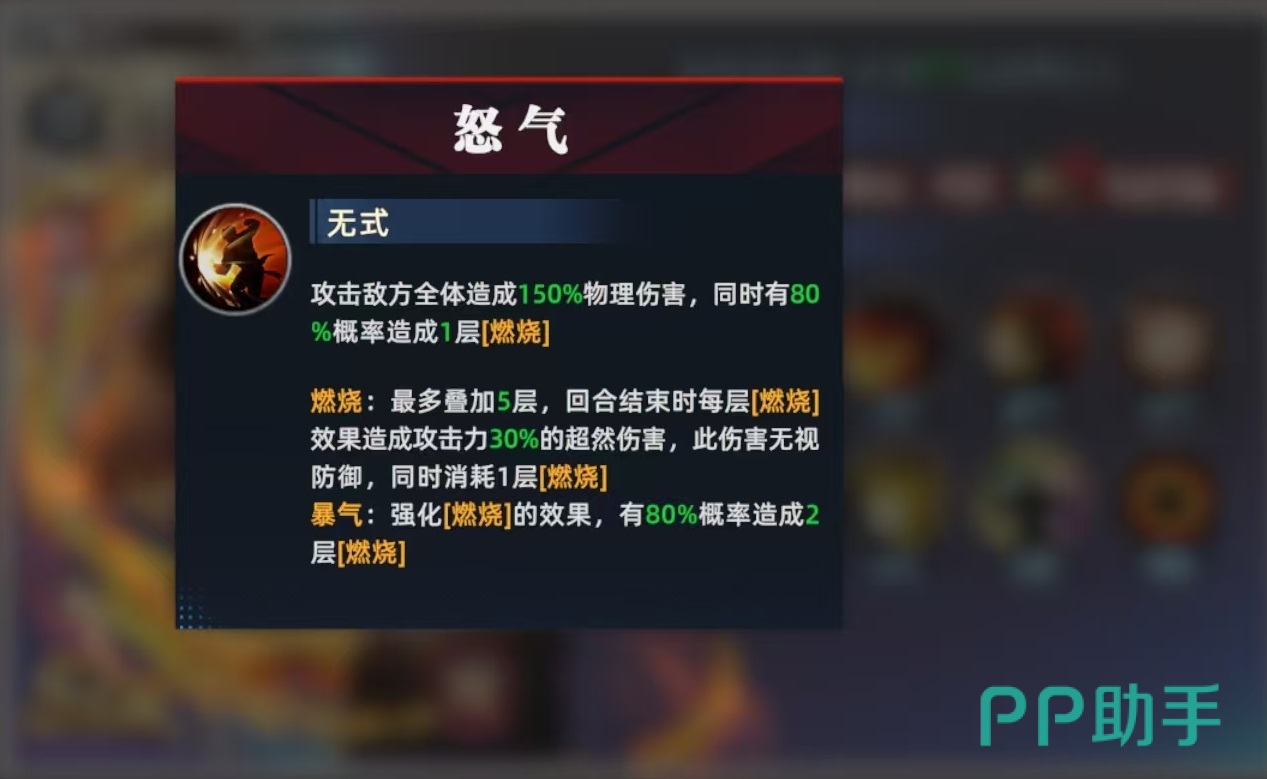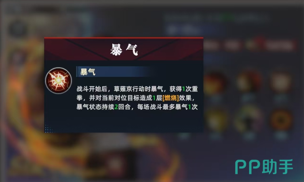 草薙京是属于SSR品质的攻击型选手,自身的定位是具有超强输出,还具有燃烧以及燃烧增强的额外效果。战斗开始时可立即获得600点额外怒气,所以短回合内就能打出很高的爆发输出。自身的爆气在战斗开始,行动时直接就能触发,获得一次重拳,并对当前的对位目标造成一层燃烧效果,爆气状态持续两回合。这样的爆气就和其他角色有所不同,开局即爆发。