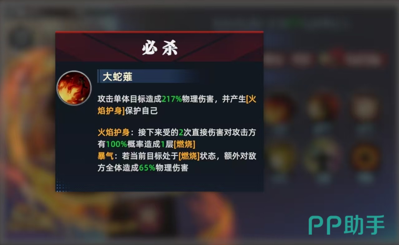 在技能方面,必杀技效果是攻击单体目标,造成高额物理伤害后,获得火焰护身保护自身。在火焰护身的影响下,接下来受到的两次直接伤害,会对攻击目标造成一层燃烧。在爆气的状态下,如果输出目标处于燃烧状态,那么额外对敌方全体造成一次物理伤害。也就是如果是带有燃烧状态的目标来攻击草薙京,并且草薙京处于暴气状态下,那么对方全体就会受到一次输出。