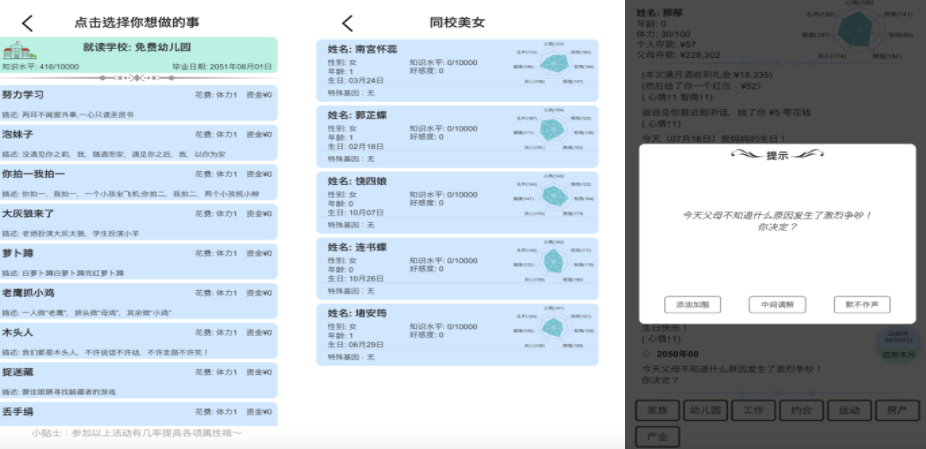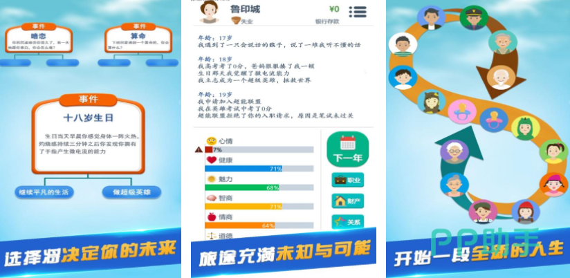 我的人生大冒险,让玩家重新开启一段新的人生,可以从出生开始,进行人生路线的规划,在这个过程中,会遇到大量的事件和抉择,每次抉择都会改变人生的整体走向,玩家可以顺其自然的让角色自由发展,也可以制定一个目标,通过在游戏里不断努力,可以顺利达成目标,过上一段完全不同的人生。