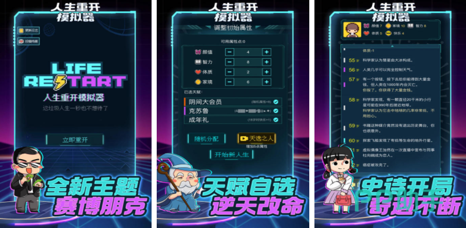 如果玩家感觉自己的生活比较平淡,那就可以通过人生重开这个游戏,重新体验一个完全不同的人生,游戏里,系统会随机给玩家设定一个出身,玩家需要在这个基础之上不断做出选择,改写角色的性格,i这样角色可以拥有一个完全不同的第二人格,通过这种方式,人物的整个人生也会发生巨大的变化,里面会有很多奇遇,能在这个文字世界,通过不断选择改写角色的人生走向。