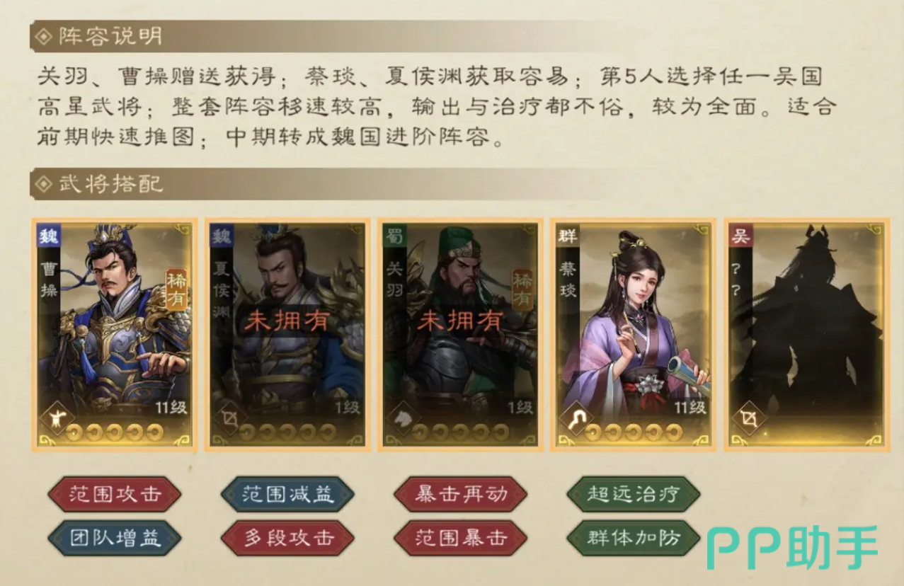蜀国过渡的阵容,虽然这个阵容也是值得认可的,但是大家要注意,这个阵容只适合过渡,不过在推图的时候,却能够发挥出巨大的价值,其中刘备作为主力,能够增强输出能力,黄忠作为远距离输出比较安全,而且又特别的稳定。赵云作为前排能够直接打乱敌人的阵型,华佗负责治疗,关银屏能够快速的击杀。