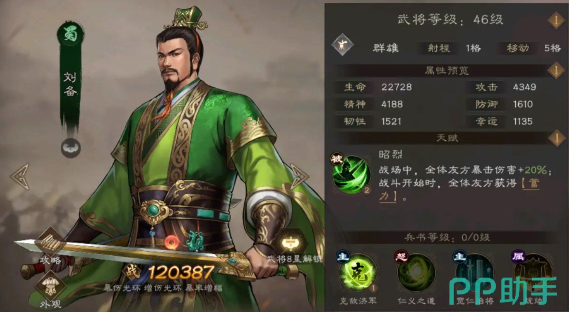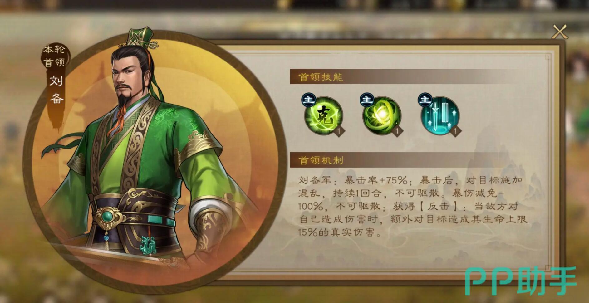 刘备是汉阵营的主力,他是群体辅助,有暴击性的输出,在战斗的时候他能实现全体buff,既能带有少量的自动恢复功能,并且随着游戏不断深入之后,他还具备暴击的特性。所以玩家在使用刘备时可以将其作为暴击吉祥物,适合一波逐流战术。